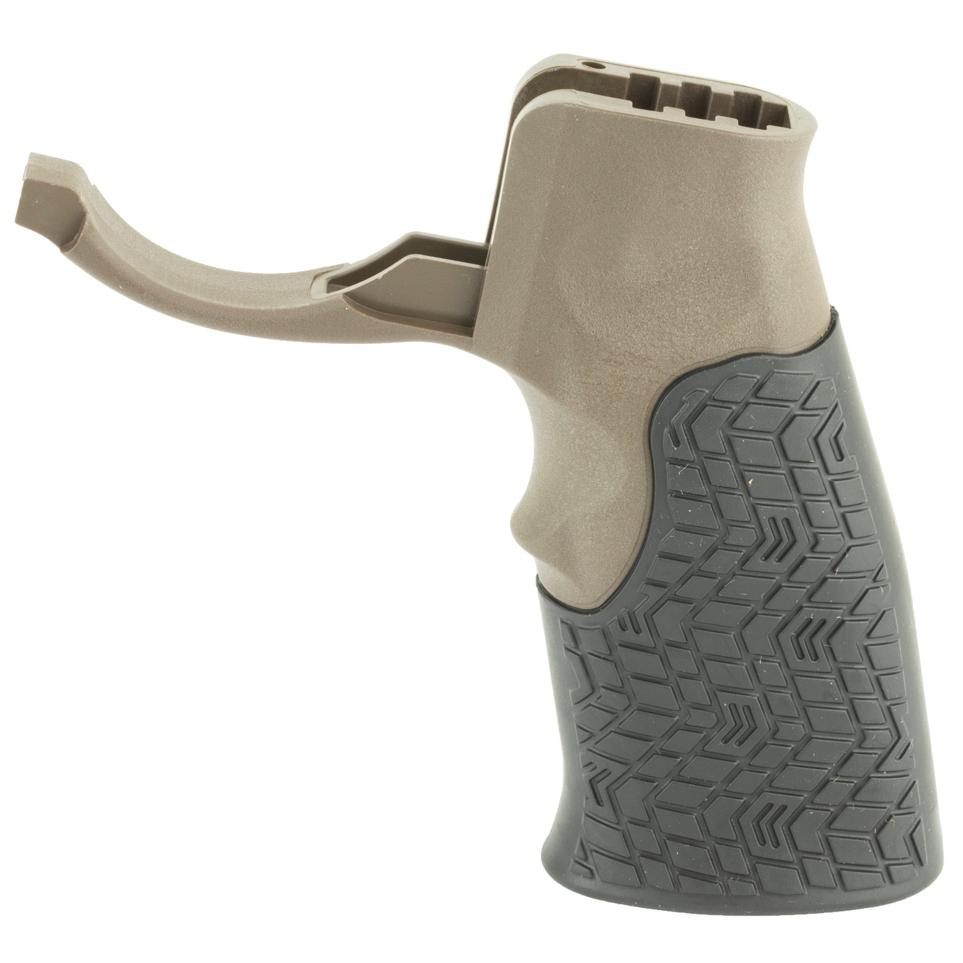 Daniel Defenses Pistol Grip is designed with ergonomics and controllability in mind. It shares the angle of the classic 1911 pistol for the most natural hand position and comfortable feel. This pistol grip incorporates an oversized trigger guard covering the gap between grip and lower receiver which can wear on the shooters hand and easily accommodates for gloves. Installation is simplified by the fact the integral trigger guard doesnt require a roll pin so there is a reduced chance of damaging the lower receiver. A soft touch overmolding section enhances grip, wet or dry.