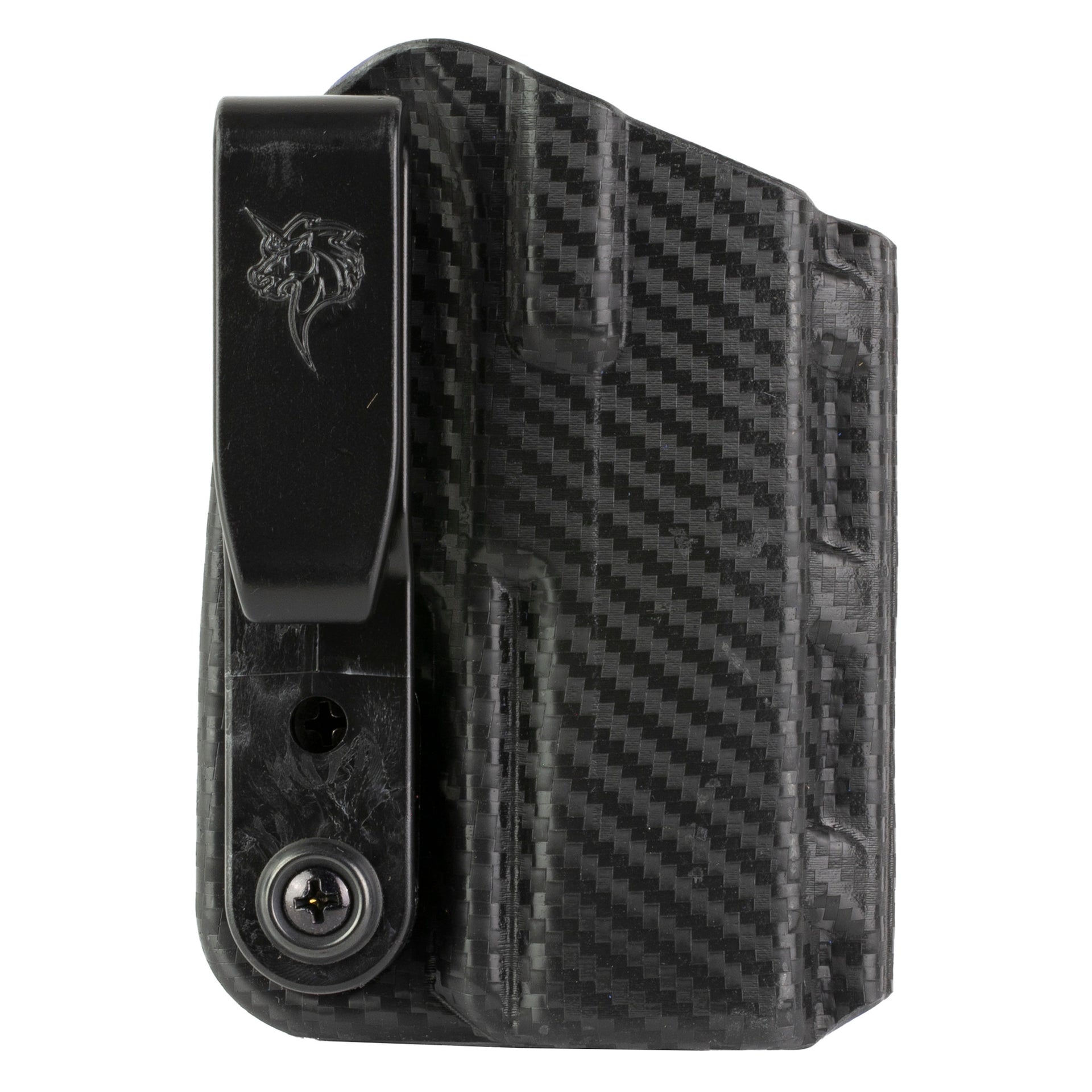 The Slim-Tuk Carbon Fiber is a minimal ambidextrous IWB holster fashioned from Kydex sheet. One of the most unique features about this IWB holster is that it uses DeSantis tuck-able 360 C-Clip, which affords the wearer unlimited mounting options. The hardware can easily be reversed to change from right to left hand. The Slim-Tuk is precision molded and has adjustable tension and a rugged 1.75" nylon clip. Carbon Fiber exterior finish with a Blue Kydex interior.