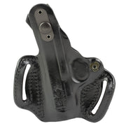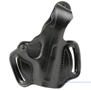 Premium saddle leather, double seams and a highly detailed molded fit, make this exposed muzzle, tight fitting, two-slot holster a great choice for your favorite pistol. It features an adjustable-tension device. Belt slots are 1 3/4" wide.