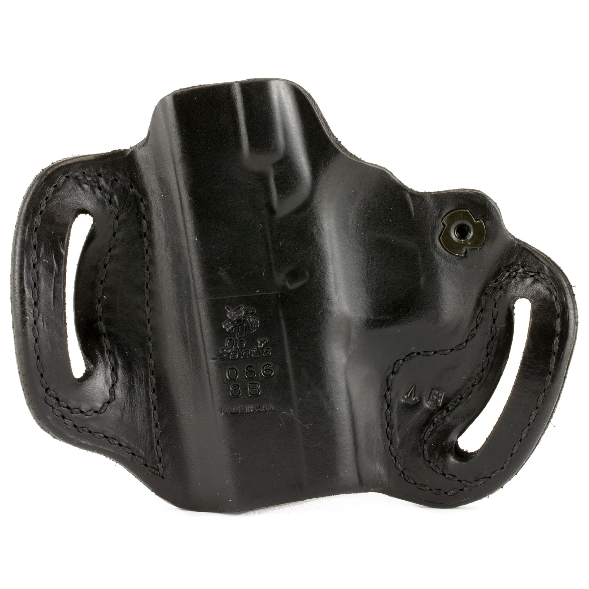 The Mini Slide(R) is a premium saddle leather, double seams and a highly detailed molded fit, make this exposed muzzle, tight fitting, two-slot holster a great choice for your favorite pistol. It features an adjustable-tension device. Available in black or tan unlined leather. Belt slots are 1 3/4" wide.