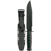 The popular KA-BAR Fighter now with a straight edge. Featuring an 8" 1095 Cro-Van steel blade. Includes black hard plastic sheath.