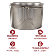 Elevate your outdoor experience with Rothco’s G.I. Style Stainless Steel Canteen Cup. Boasting a substantial 24oz. capacity, this versatile canteen cup seamlessly fits under all one-quart plastic canteens. The butterfly handle adds functionality, extending out 2 3/4" with a 3 1/8” hand opening for a secure grip. Crafted with precision, the G.I. Canteen Cup measures top dimensions of 5 1/4” x 3 1/4”, bottom dimensions of 4 1/2” x 2 7/8”, and a height of 3 3/4”. Whether you're camping, hiking, or engaging in any outdoor activity, this stainless steel canteen cup is the perfect companion. Experience durability, practicality, and convenience in every sip, making it an essential addition to your outdoor gear.