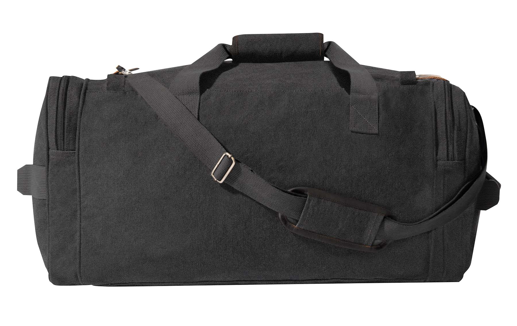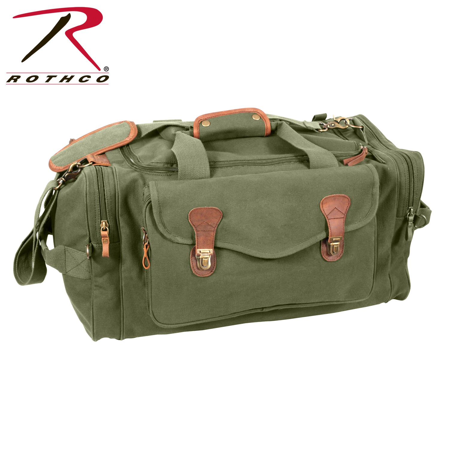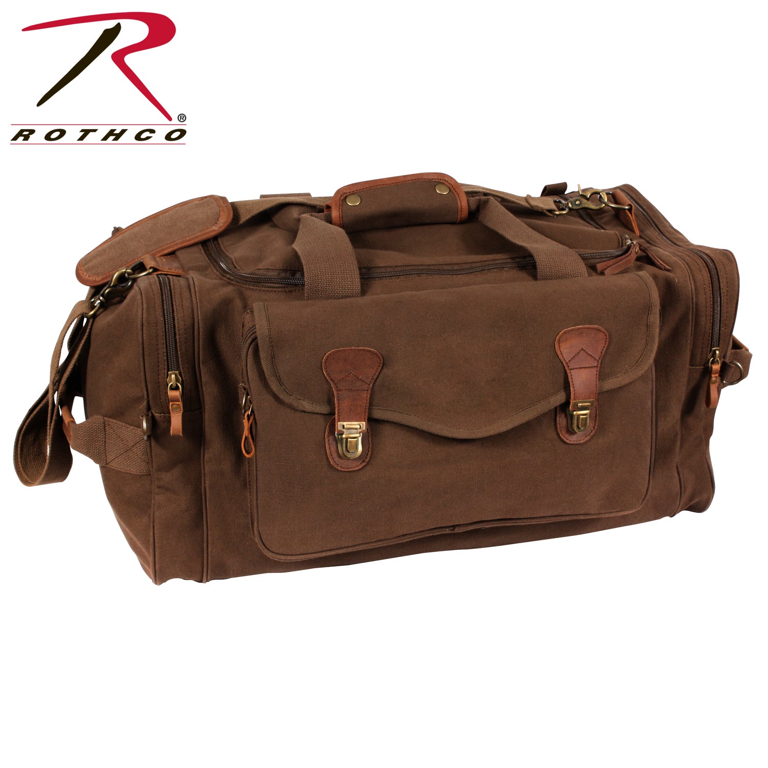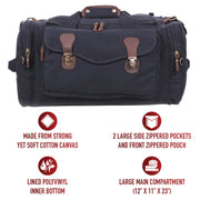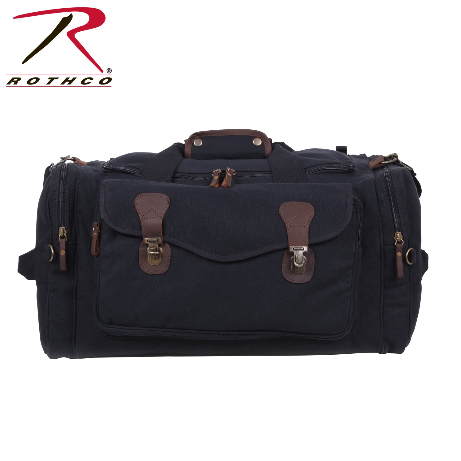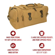 Experience the perfect blend of style and functionality with Rothco's Canvas Long Weekend Bag. Designed for your getaway essentials, this bag features a large main compartment measuring 12 inch x 11 inch x 23 inch, ensuring ample space for your next adventure. Constructed from robust yet soft cotton canvas, it offers long-lasting durability. The lined polyvinyl inner bottom protects your belongings from getting wet. 2 large side zippered pockets provide convenient storage for toiletries, shoes, and electronics, while the front zippered pouch with flap and push-button buckles keeps important travel documents safe and easily accessible on the go. The reinforced top and dual side carry handles, adorned with leather trim, add a touch of sophistication. Leather zipper pulls and accents complete the look, making it a stylish travel companion. Versatile and practical, this bag is perfect for weekend trips and makes an excellent gift. Its spacious design is suitable for screen printing and embroidery, allowing you to personalize it with your unique style. Made from Rothco’s durable heavyweight canvas fabric, this superior material is naturally water-resistant, rugged, and is built for the long haul. No one comes close to Rothco’s collection of ultra-premium canvas bags and packs.