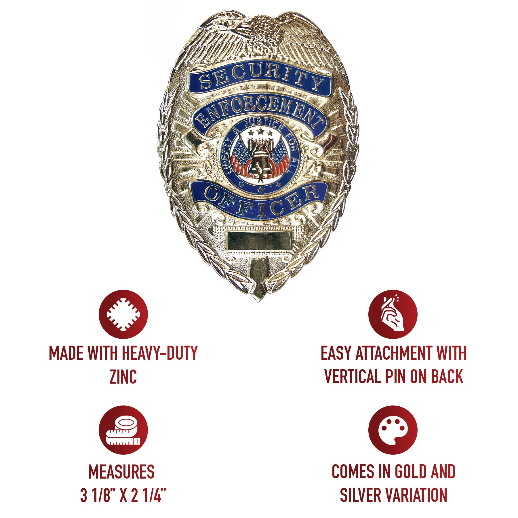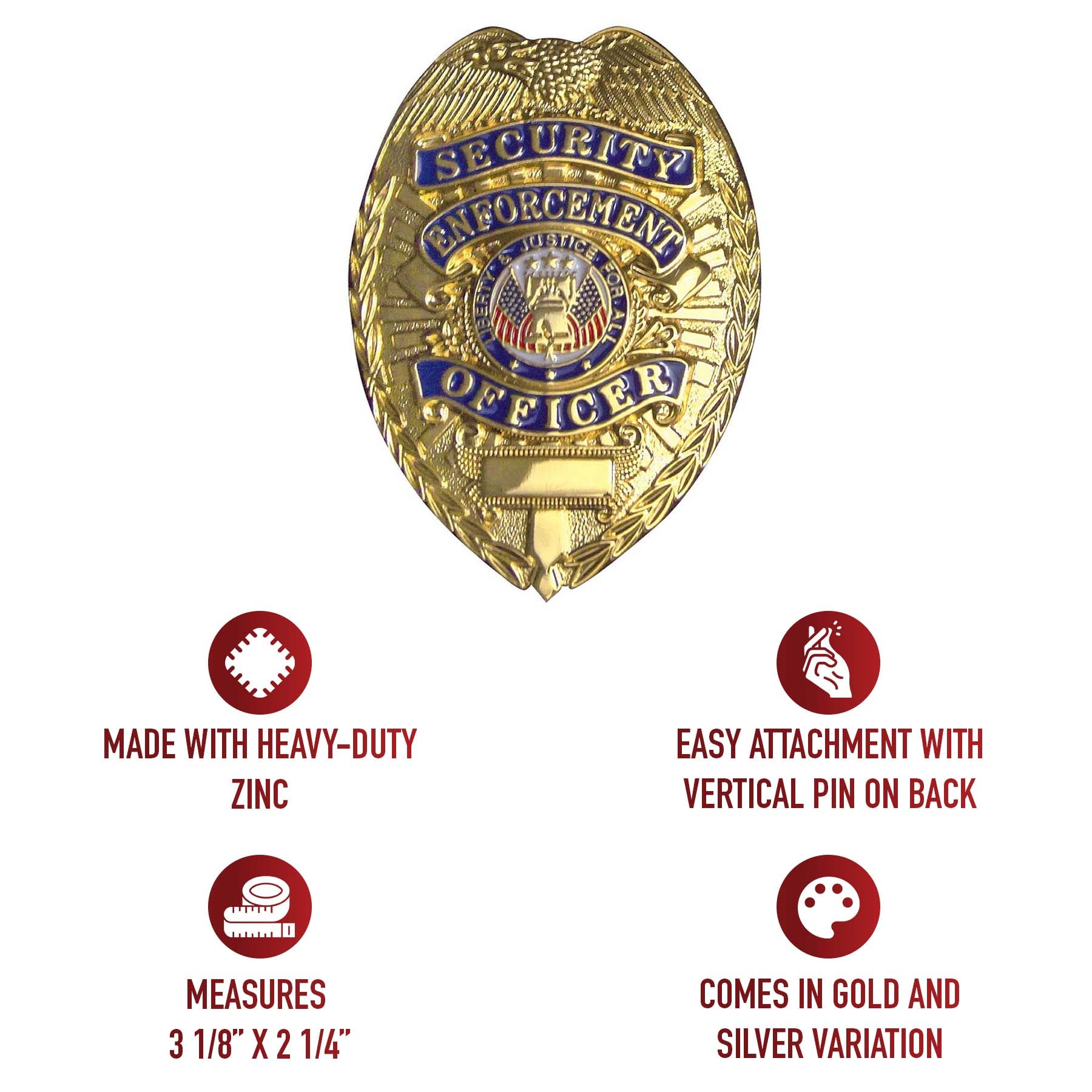 Rothco's Deluxe Security Enforcement Badge adds a touch of professionalism and authority to any security uniform. Available in both gold and silver finishes, this badge measures 3 1/8 inch x 2 1/4 inch, making it a standard size suitable for most security badges. Crafted with durability in mind, it is built to withstand daily wear and tear, maintaining its polished appearance over time. The badge features a sturdy pin backing, ensuring easy and secure attachment to clothing or accessories. Whether you're a security professional, law enforcement officer, or badge collector, this Deluxe Security Enforcement Badge offers versatile use and an authentic look. It's perfect for enhancing the appearance of your uniform or adding to your collection. Elevate your presence and command respect with Rothco's Deluxe Security Enforcement Badge.