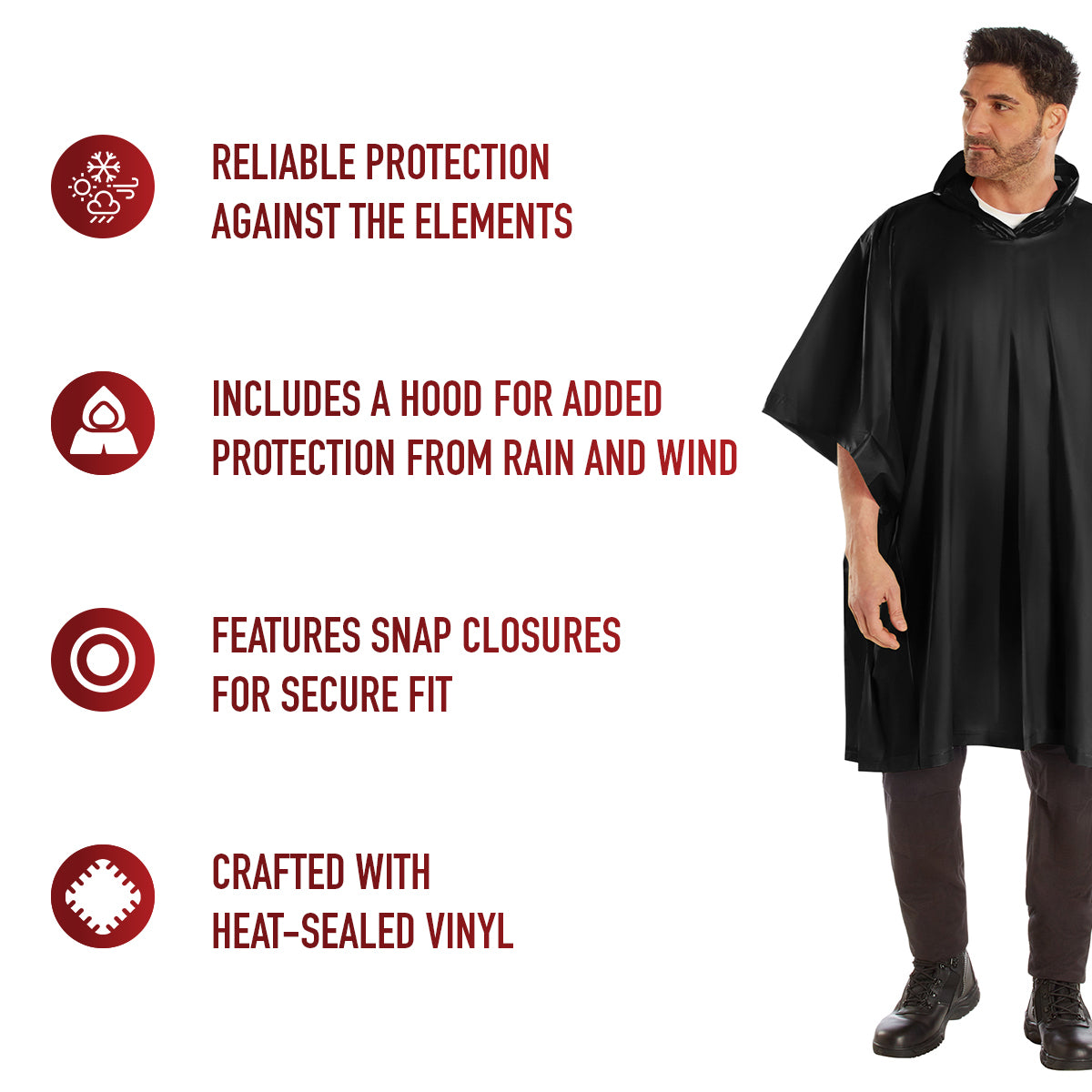 Stay dry during rainy days with Rothco's heat-sealed vinyl poncho. Featuring a hood, snap closure, and a convenient carry pouch, this portable rain poncho offers reliable protection from wet weather and is compact for storage.