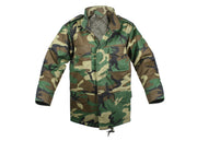 Rothco Kid's M-65 Field Jacket is the ideal outerwear for your child's outdoor adventures. Crafted from a durable 55% cotton / 45% polyester twill outer shell, this field jacket is designed to withstand the elements and provide long-lasting wear. The water-repellent finish ensures your child stays dry in wet conditions, while the built-in quilted liner made of 100% polyester adds an extra layer of warmth and comfort. The outdoor jacket features a hook & loop neck closure and a concealed hood with a brass zipper closure for added protection against wind and rain. The hood matches the color of the outer shell and is detachable for versatile wear. With button-down epaulettes, large chest pockets with snap closures, and large waist cargo pockets with snap seals, this all-weather jacket offers ample storage space for all your child's essentials. Hook & loop wrist cuffs allow for attachment to gloves, ensuring a secure fit. The right-hand zipper pull and bottom drawstring provide additional functionality and comfort, while snap-up storm flaps offer extra protection from the elements. Rothco Kid's M-65 Field Jacket is a classic and practical choice for any young adventurer.