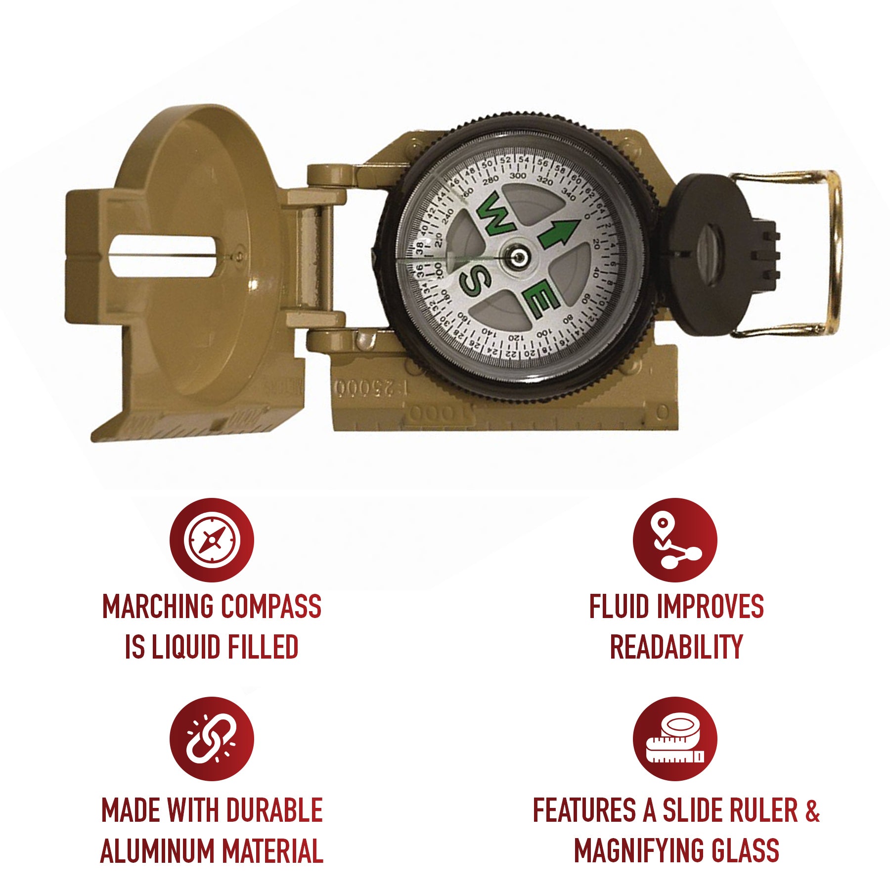 Embark on your outdoor journeys with confidence using Rothco's Military Marching Compass. Designed for military use, this compass is a reliable navigation tool for active-duty personnel, adventurers, hikers, campers, and outdoor enthusiasts. Constructed with precision and durability in mind, Rothco's Military Marching Compass features a liquid-filled design that minimizes excessive swing or wobble, ensuring optimal accuracy even in challenging terrain or conditions. This fluid enhances readability and protects the compass's internal mechanisms from wear and tear during extended use. Equipped with essential navigational aids, this compass includes a slide ruler for precise measurements and calculations, allowing you to plot your course with accuracy. The integrated magnifying glass provides clear visibility of map details and fine print, enhancing your ability to interpret topographic maps or trail guides. Crafted with an aluminum cast case, Rothco's Military Compass is built to withstand rugged outdoor environments, ensuring reliable performance in any situation. Its sturdy construction offers protection against impacts, bumps, and other hazards encountered during outdoor expeditions. Available in three distinct colors, including black, olive drab, and coyote brown, the compass allows you to choose the option that best suits your preferences or blends seamlessly with your outdoor gear and apparel. Whether you're embarking on a hiking expedition, navigating unfamiliar terrain, or exploring the great outdoors, Rothco's Marching Compass is an essential tool for ensuring you stay on course and reach your destination safely. With its durable construction, reliable performance, and versatile features, this compass is a must-have addition to your outdoor gear collection.