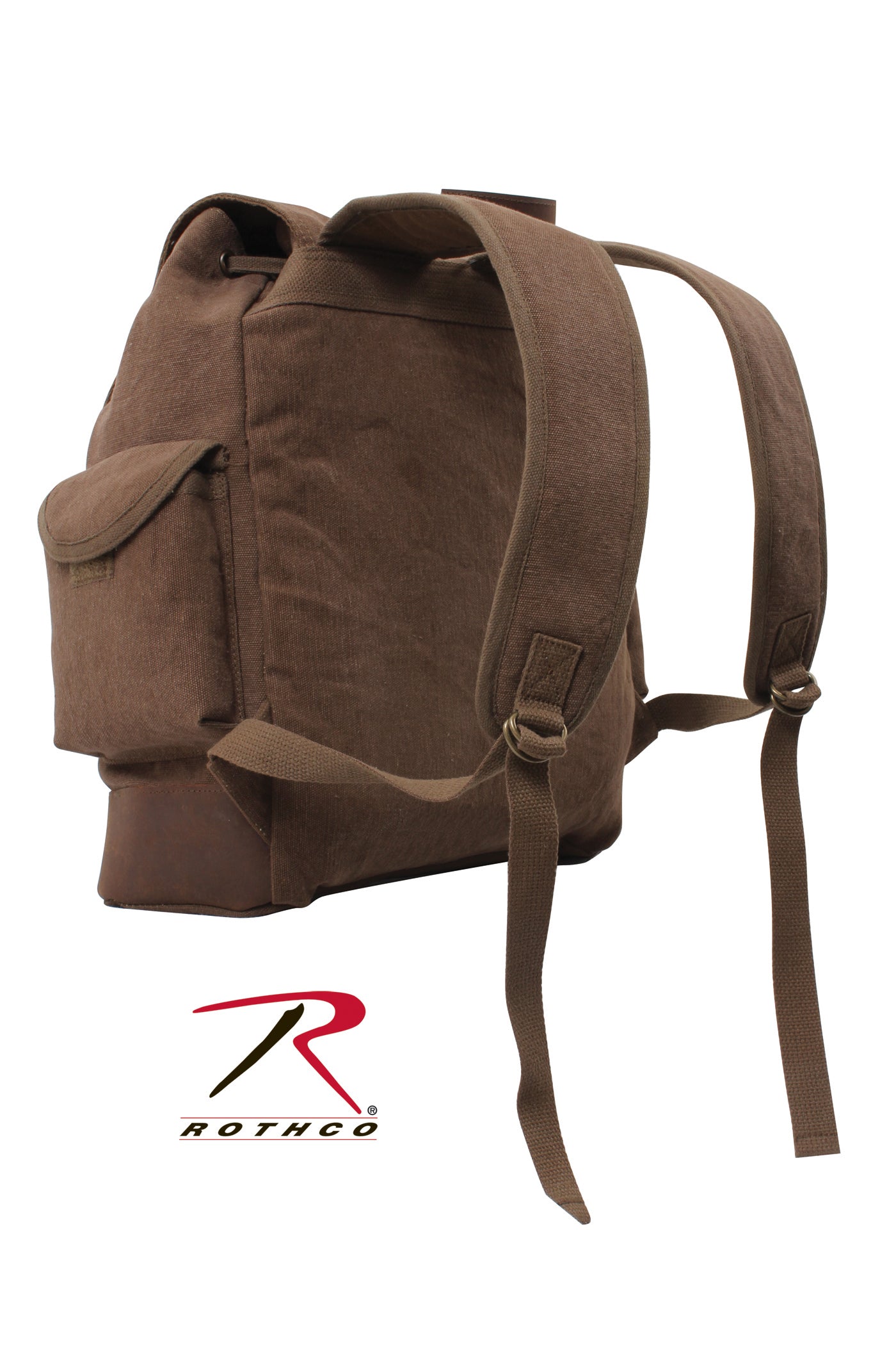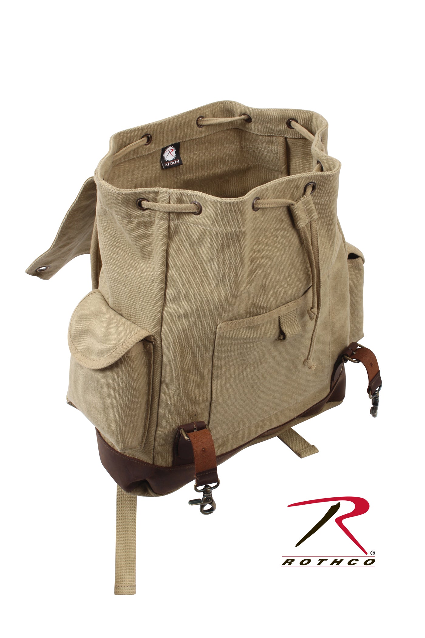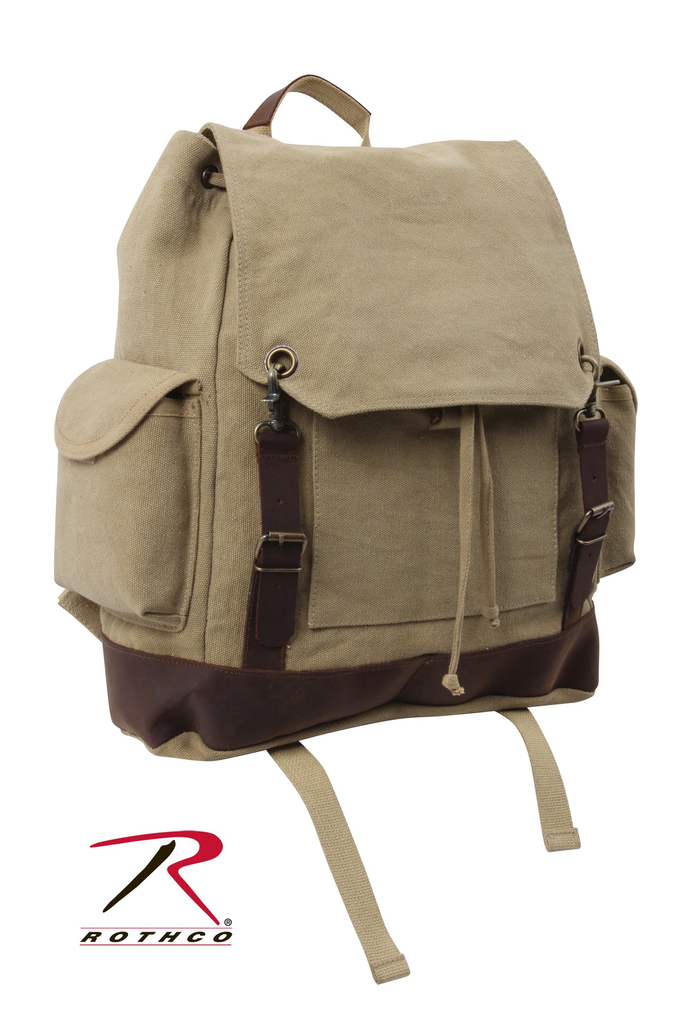 Explore in style with Rothco's Vintage Expedition Rucksack. Crafted from robust cotton canvas with leather accents, this vintage style backpack is perfect for urban outings, wilderness treks, everyday use, and more. Made from Rothco’s durable heavyweight canvas fabric, this superior material is naturally water-resistant, rugged, and is built for the long haul. No one comes close to Rothco’s collection of ultra-premium canvas bags and packs.