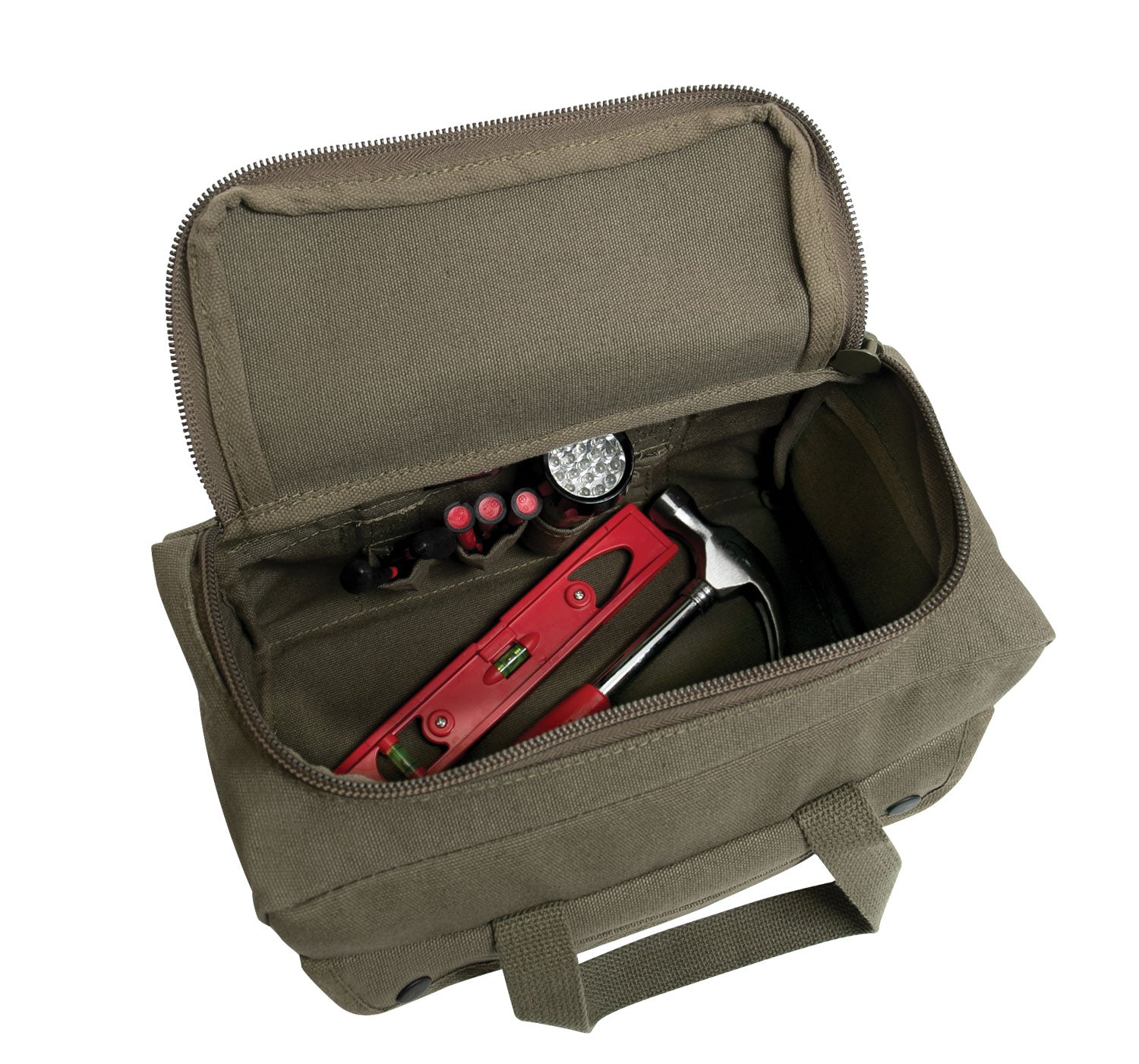 Inspired by the classic service mechanic's tool bag, this wide mouth version is a great alternative to a traditional metal toolbox. Crafted with rugged heavyweight canvas, it offers durability for storing all your tools. With a U-shaped zipper design, it provides easy access to the interior, while 8 organizer pockets help keep your tools organized. 2 outside snap pockets offer additional storage for small items, and a hard plastic bottom insert ensures stability when the bag is open. The sturdy reinforced top carry handles make it easy to transport your tools wherever you need them. Perfect for mechanics, DIY enthusiasts, and anyone in need of reliable tool storage on the go. Made from Rothco’s durable heavyweight canvas fabric, this superior material is naturally water-resistant, rugged, and is built for the long haul. No one comes close to Rothco’s collection of ultra-premium canvas bags and packs.