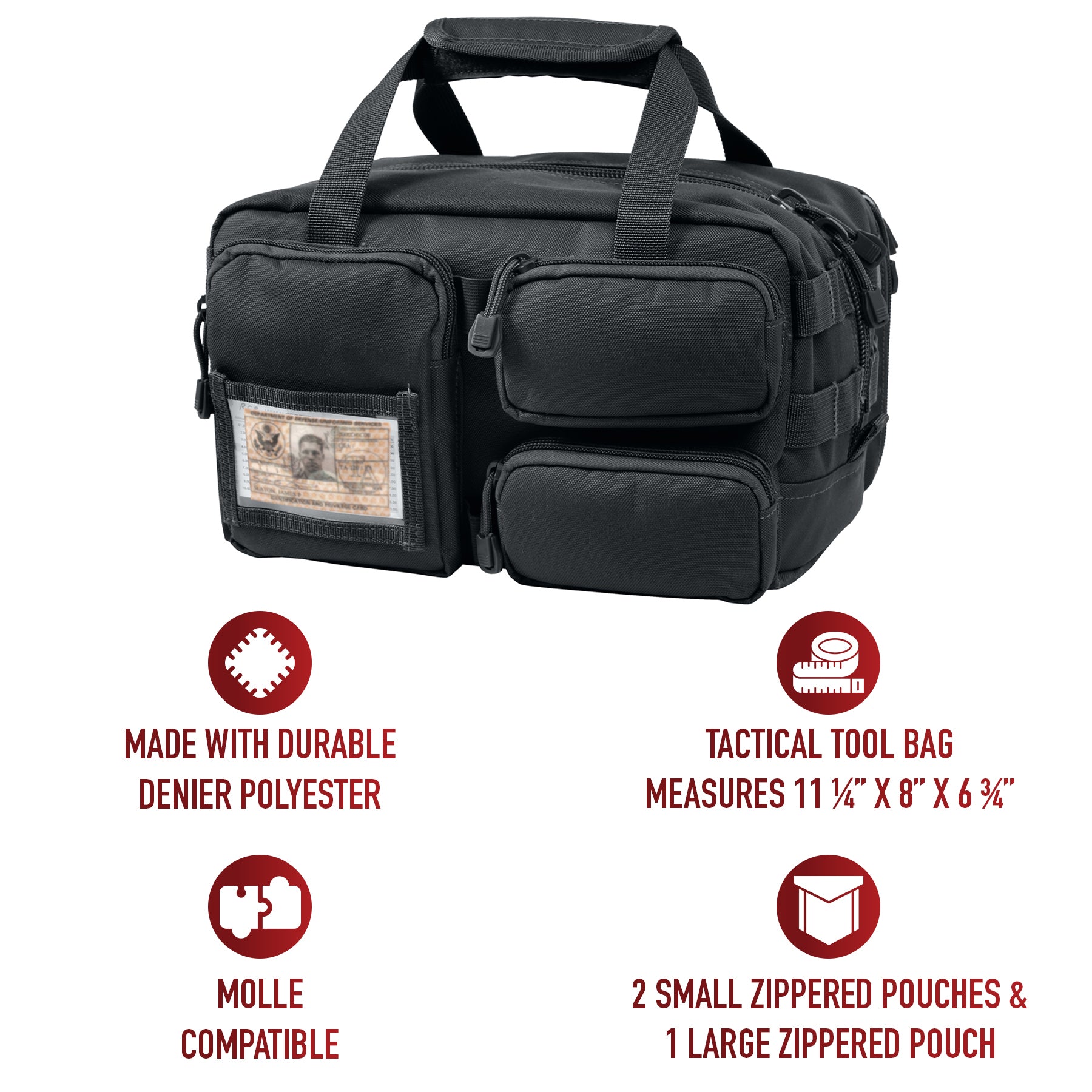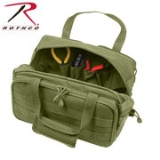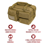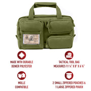 Rothco elevates the classic mechanic’s tool bag with enhanced features. Crafted from tough denier polyester, the Tactical Tool Bag boasts a main zippered compartment with individual slots for tools, 2 small external zippered pouches, and a rear drop-down compartment with pen/flashlight slots, card holders, and a removable pouch. The bag also includes MOLLE loops on the back and sides for additional attachments. Compact yet spacious, the equipment bag measures 11.25 inches x 8 inches x 6.75 inches. With a large external zippered pouch featuring an identification window on the front and a convenient carry handle, the Tactical Tool Bag is ideal for professionals and enthusiasts alike.