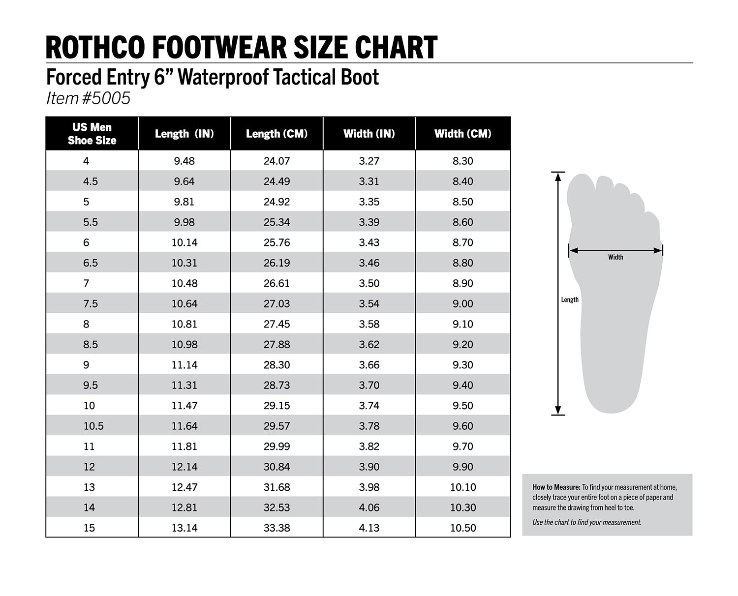 Experience unmatched comfort and protection with Rothco’s 6-inch Forced Entry Tactical Waterproof Boot. Crafted with a 100% waterproof membrane, slip-resistant cup sole, gusseted tongue, steel shank, and rust-proof hardware. Designed with precision and built to withstand the harshest conditions, Rothco's collection of footwear and accessories combines durability, functionality, and unparalleled performance. From our Forced Entry Series which features our speedlace and waterproof technologies, to our V-Max Collection designed with lightweight running shoe soles, our diverse range of footwear provides unmatched comfort and protection for everyone from active-duty personnel to outdoor enthusiasts. With a rich heritage spanning over 7 decades, Rothco is the go-to brand for all things that keep you standing on your feet.
