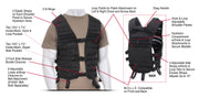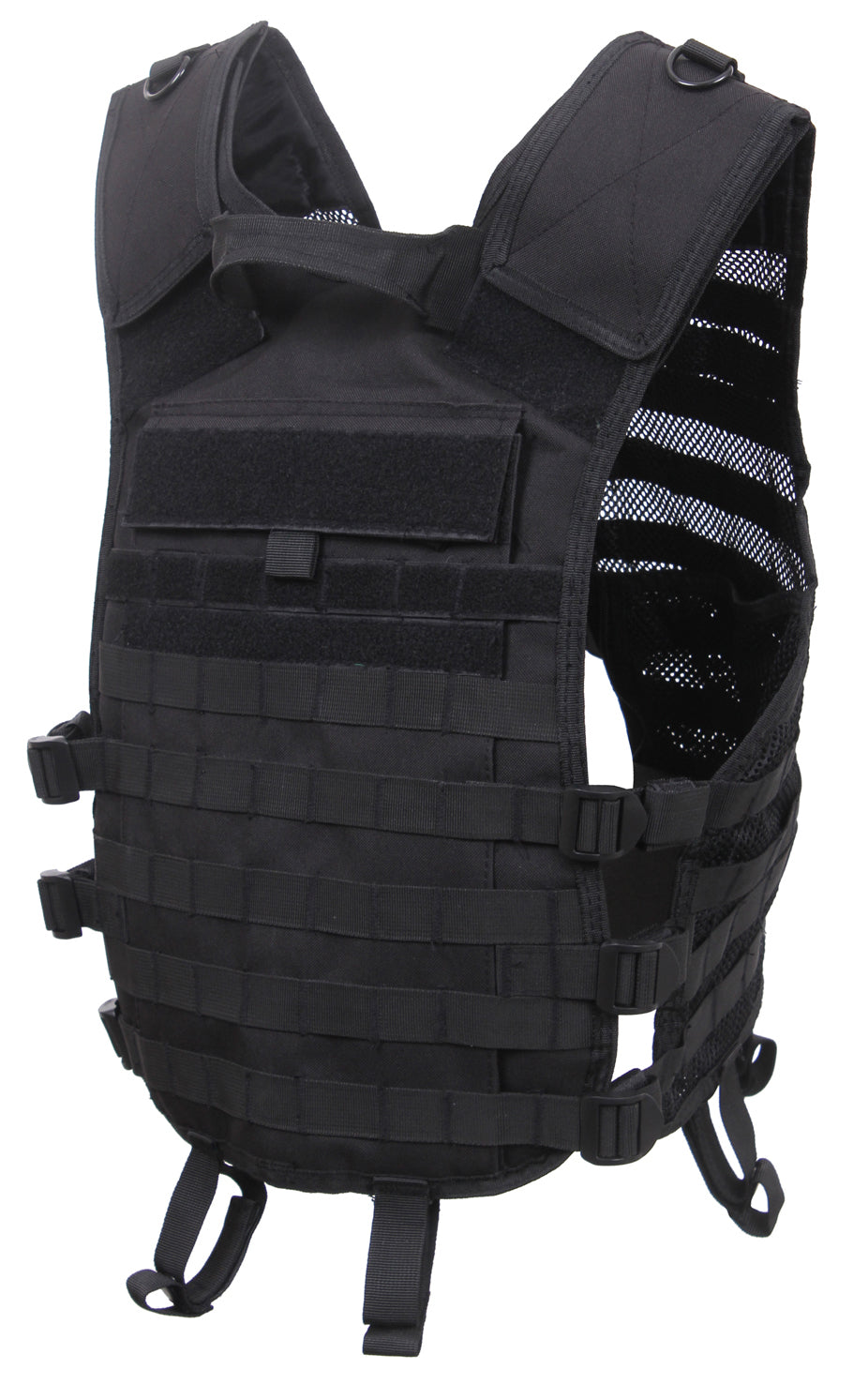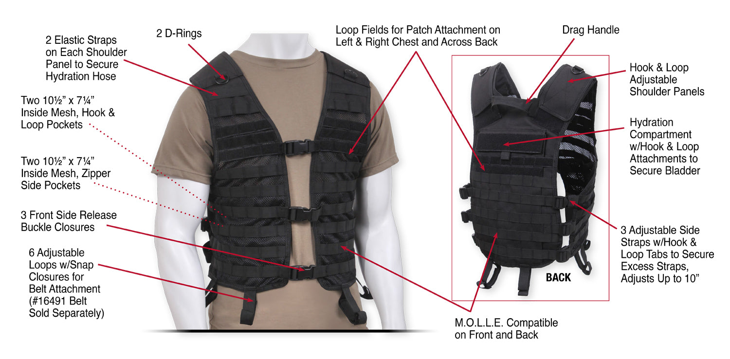 The front and back of the utility vest features multiple rows of MOLLE loops for fastening Modular Lightweight Load-carrying Equipment compatible gear and pouches. Numerous strips of loop field on both the front chest and back of this tactical vest allow for patch attachment and hook and loop accessories. Our MOLLE vest is crafted for comfort, with hook and loop adjustable shoulder panels, 3 side straps adjustable up to 10 inches, and 3 front side release buckle closures so that you can adjust to your perfect, secure fit. Side straps on this lightweight vest feature hook and loop tabs to tame excess straps. This M.O.L.L.E. vest is hydration compatible, offering 2 elastic straps on each shoulder panel to secure hydration hose, along with a hydration compartment with hook and loop attachments on back to secure a bladder. The interior features 4 mesh side pockets, 2 zippered, and 2 with hook and loop closure for storing essentials. This tactical mesh vest also includes dual D rings atop of shoulder panel and a drag handle for emergency use and 6 loops with snap closures for belt attachment (16491 belt sold separately). This vest is constructed with a breathable mesh front and durable polyester back, the optimal combination for withstanding rugged missions.