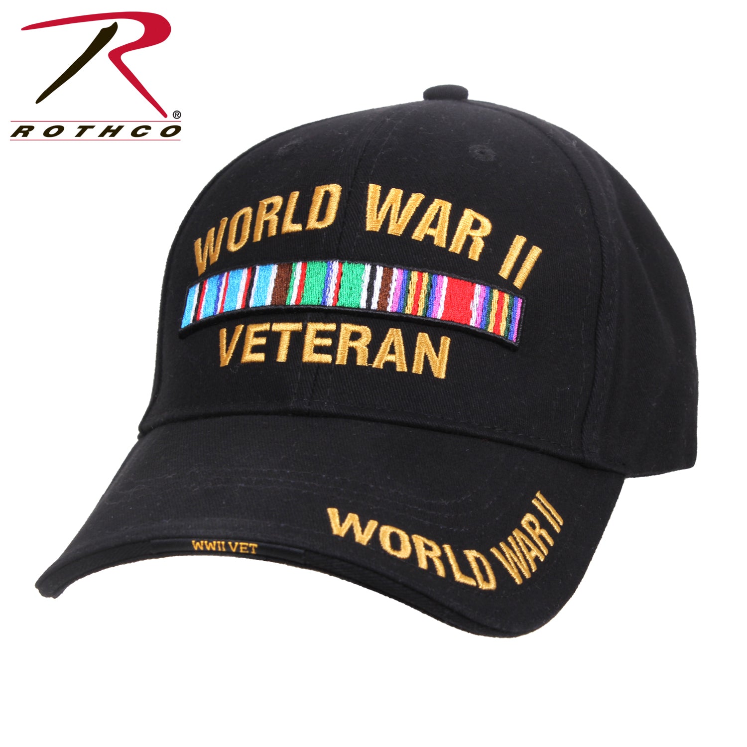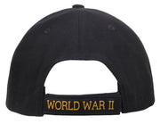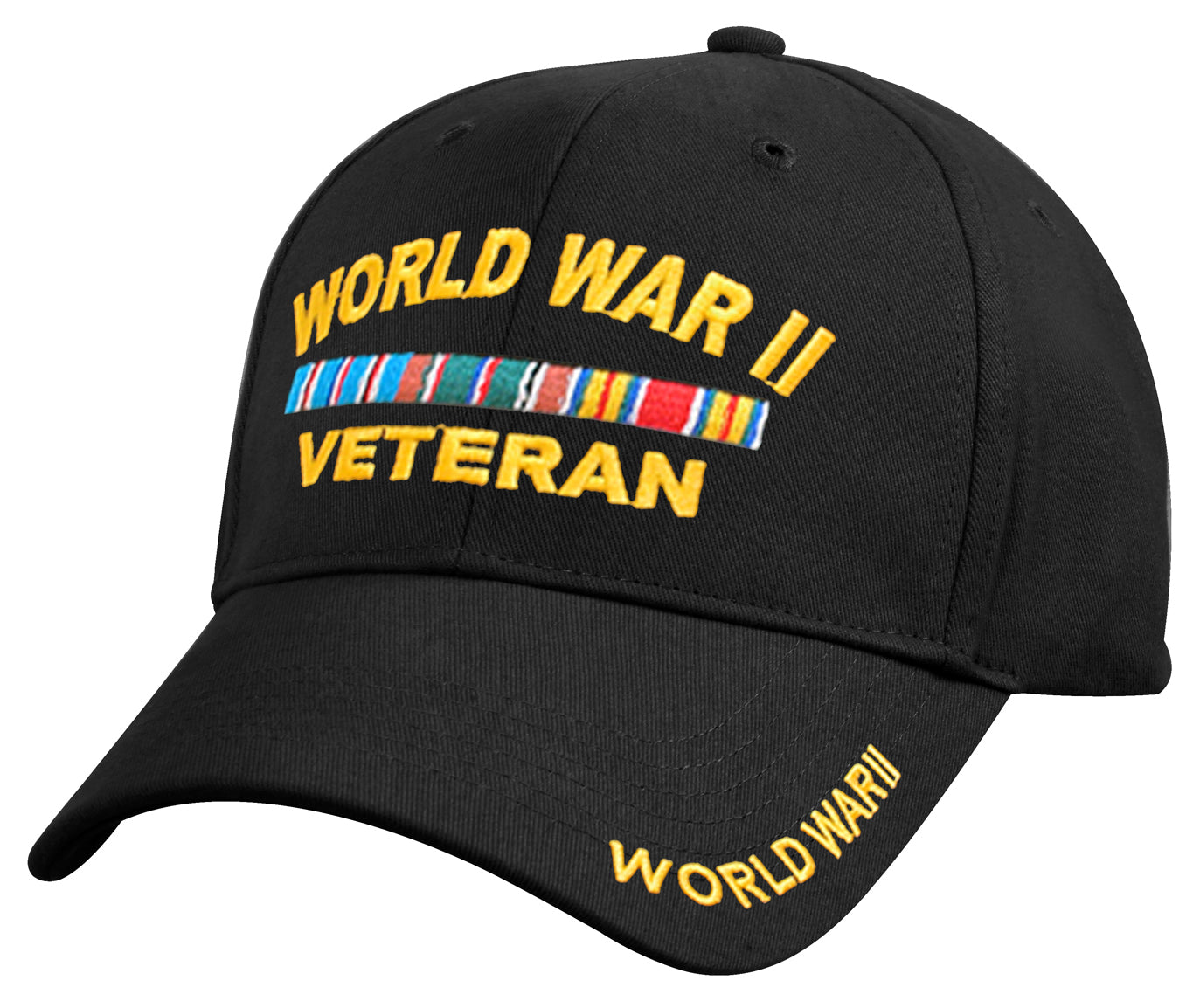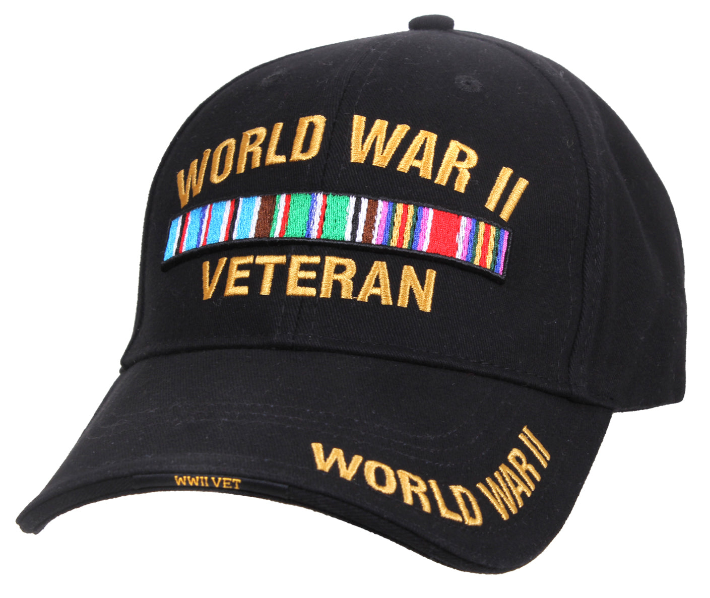 Rothco's WWII Deluxe Low Profile Cap is made from a durable 100% brushed cotton twill and features an embroidered ribbon and World War II Veteran text on the front panel, embroidered “WWII Vet” sandwich brim and upper brim. This military hat also features a hook and loop closure in the back for adjustability and a padded sweatband for added comfort.