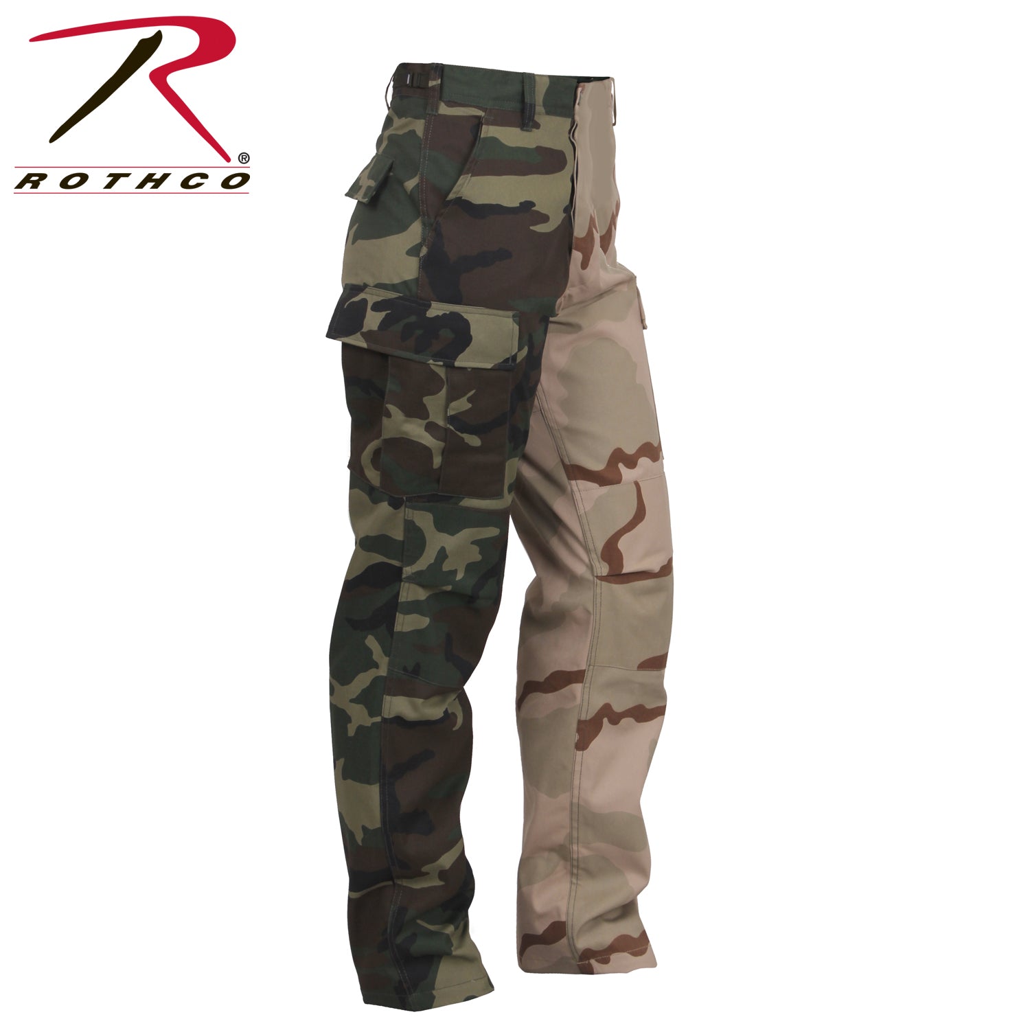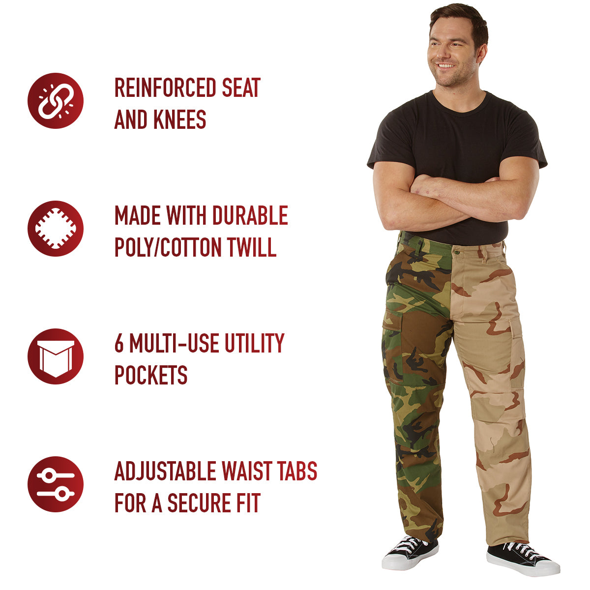 Experience the distinctive style of Rothco's Two-Tone Camo BDU Pants. Crafted from durable poly/cotton twill, these pants offer a unique blend of comfort and functionality. With adjustable waist tabs for a personalized fit and reinforced seat and knees, the cargo pants are designed to withstand rugged use. Featuring six utility pockets, these pants provide ample storage for your essentials. Perfect for outdoor adventures or casual wear, these pants are a versatile addition to any wardrobe. Rothco stands out as the leader in camouflage clothing and accessories. With a rich heritage spanning over 7 decades, we have honed our expertise in crafting durable and effective camouflage gear. Our extensive range of products, including apparel, bags, and gear, showcases a diverse selection of camouflage, with over 35 patterns available! From outdoor enthusiasts and active-duty personnel, to skate and fashion, Rothco is the go-to brand for camo.
