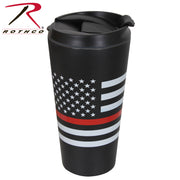 Show your support for firefighters and fire department with Rothco's Thin Red Line Flag Travel Mug. This 16oz travel cup has a double-walled, stainless steel insulation to help keep drinks hot and fresh. A US flag with a thin red line is printed on the front of the cup. The cap conveniently screws off and has a flip top for drinking. The thin red line travel mug measures 6.75" height and 3.5" diameter at widest point. Perfect for on-the-go, cars or at the office.