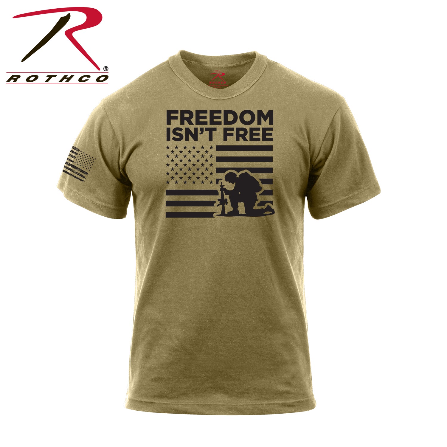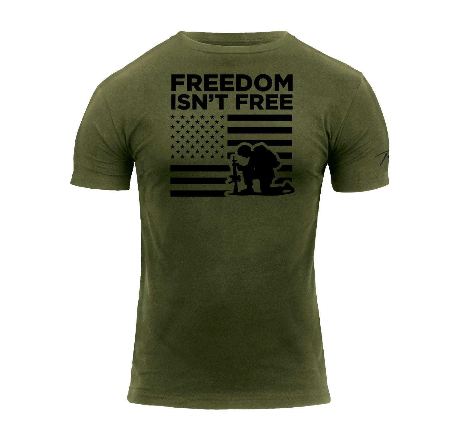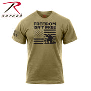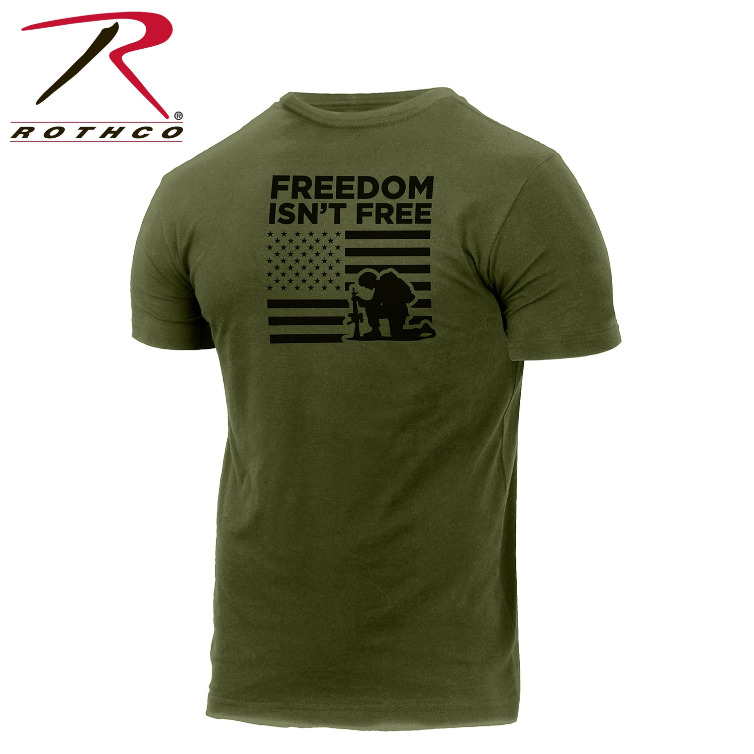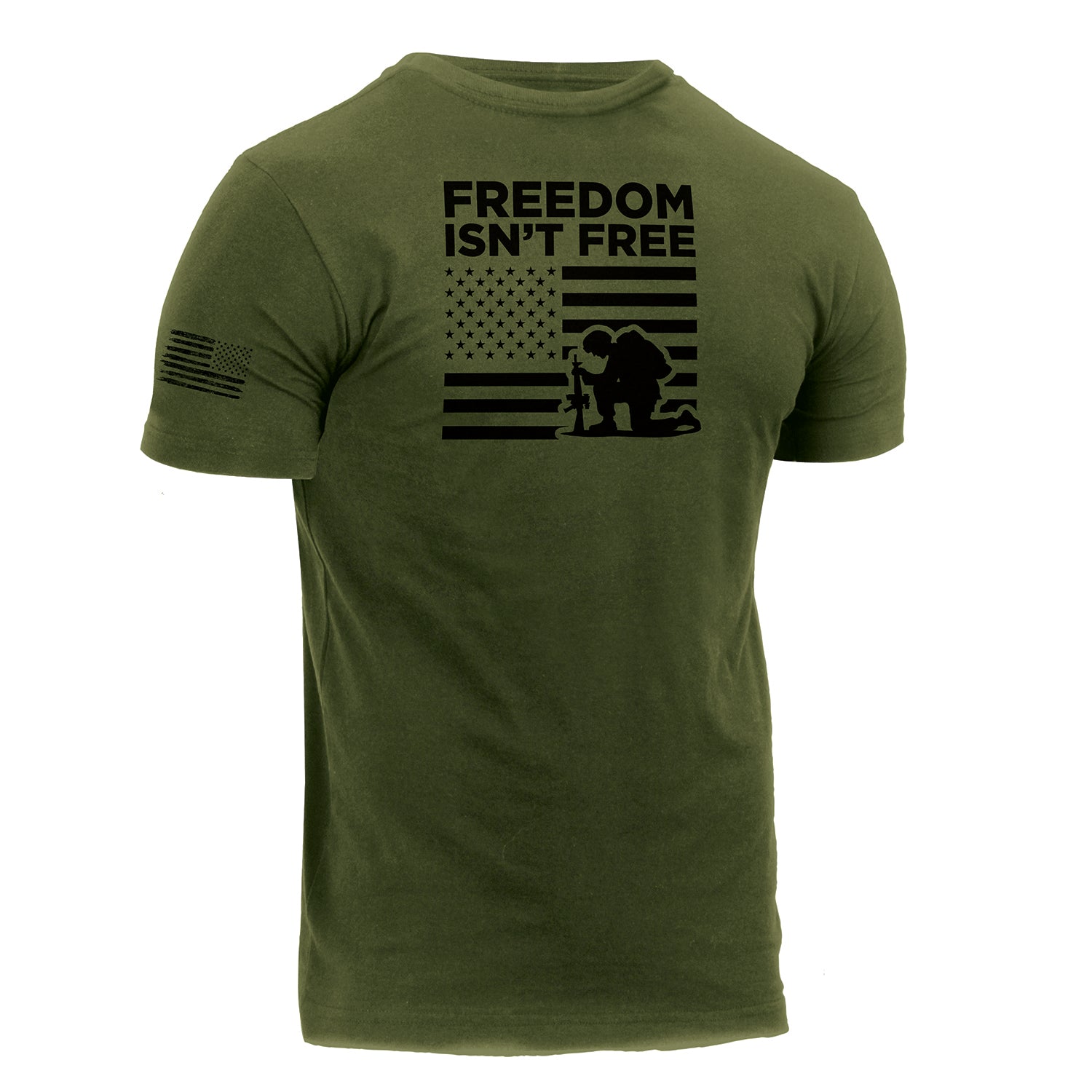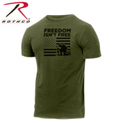 Rothco’s "Freedom Isn't Free" T-Shirt proudly displays a horizontal US flag with the poignant phrase "Freedom Isn't Free" atop, featuring a kneeling soldier silhouette within the flag. Its reverse distressed US flag graphic on the right sleeve adds a vintage touch. Crafted from a comfortable 60% cotton / 40% polyester blend, this short sleeve shirt offers lightweight wear perfect for various occasions. The tag-less printed label enhances comfort. This t-shirt is ideal for holidays like Veteran's Day, Memorial Day, and 4th of July, and is great for going to the gym or everyday wear. Pair your graphic tee with our BDU Cargo Shorts and Tactical Operator Cap.
