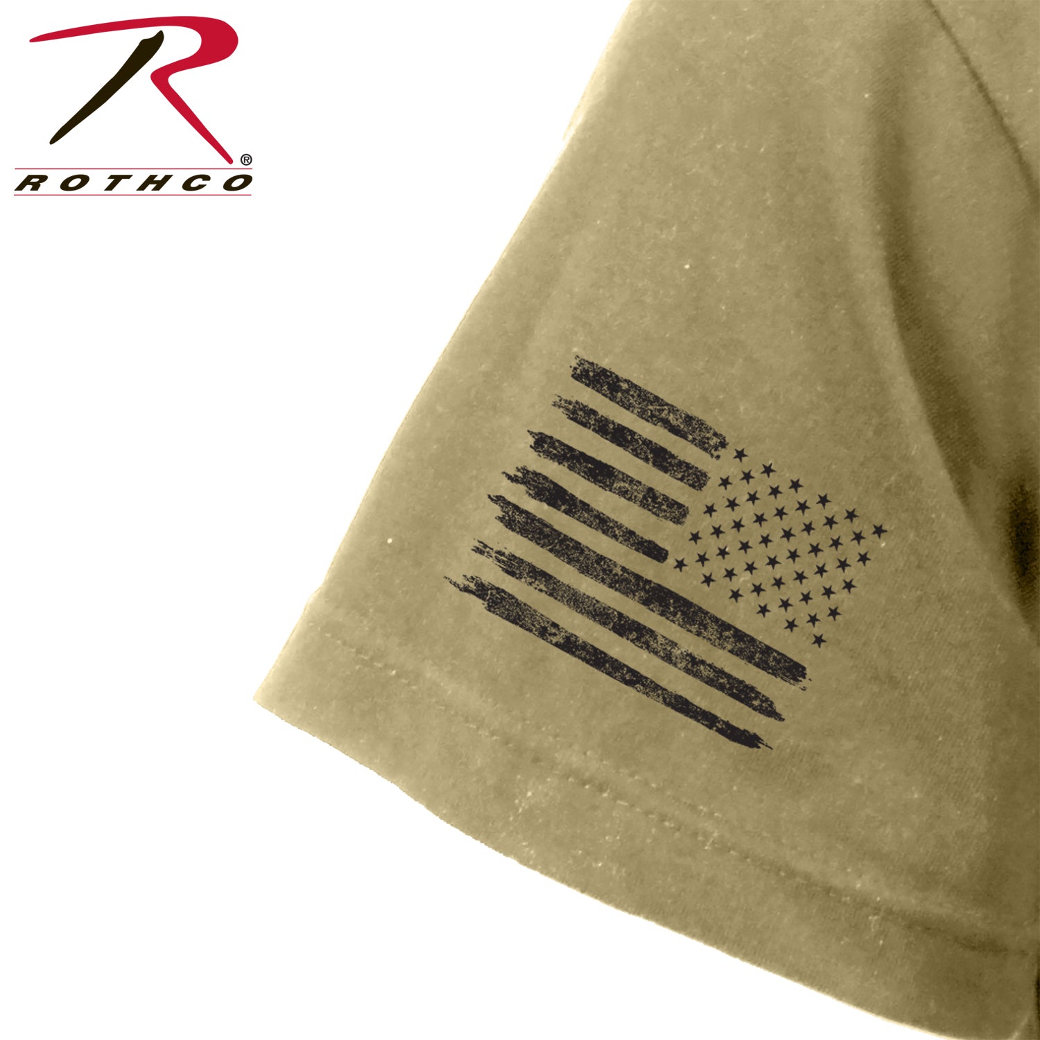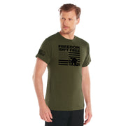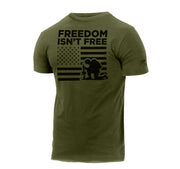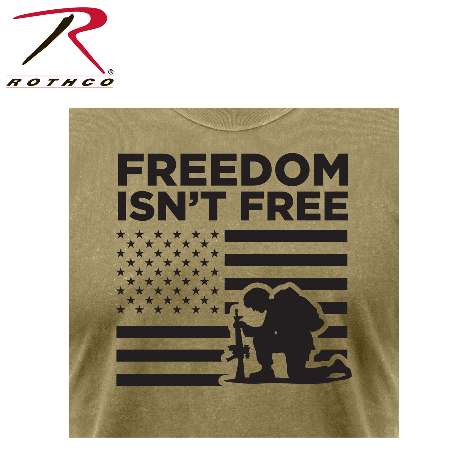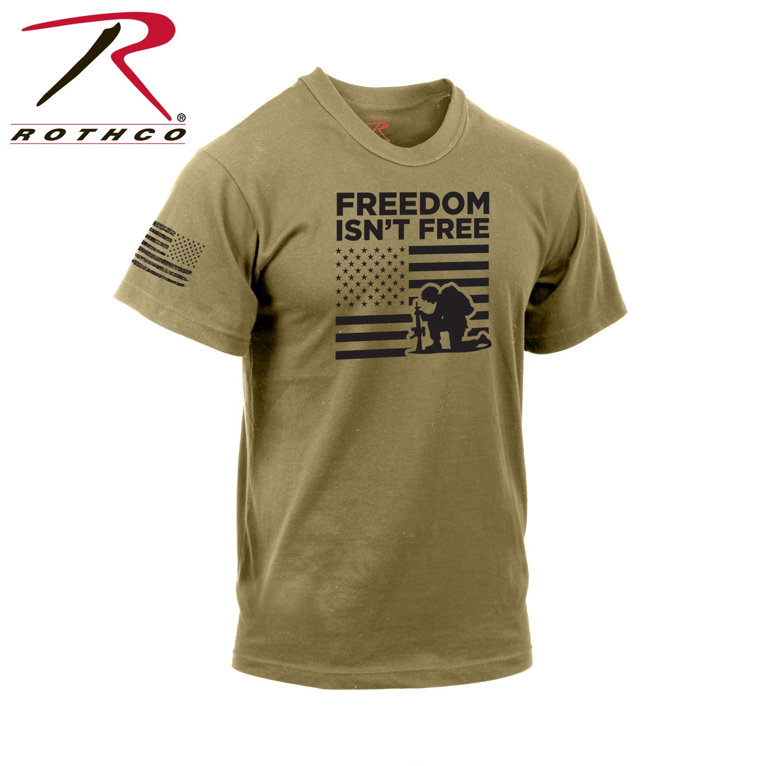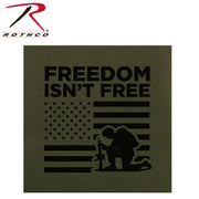 Rothco’s "Freedom Isn't Free" T-Shirt proudly displays a horizontal US flag with the poignant phrase "Freedom Isn't Free" atop, featuring a kneeling soldier silhouette within the flag. Its reverse distressed US flag graphic on the right sleeve adds a vintage touch. Crafted from a comfortable 60% cotton / 40% polyester blend, this short sleeve shirt offers lightweight wear perfect for various occasions. The tag-less printed label enhances comfort. This t-shirt is ideal for holidays like Veteran's Day, Memorial Day, and 4th of July, and is great for going to the gym or everyday wear. Pair your graphic tee with our BDU Cargo Shorts and Tactical Operator Cap.