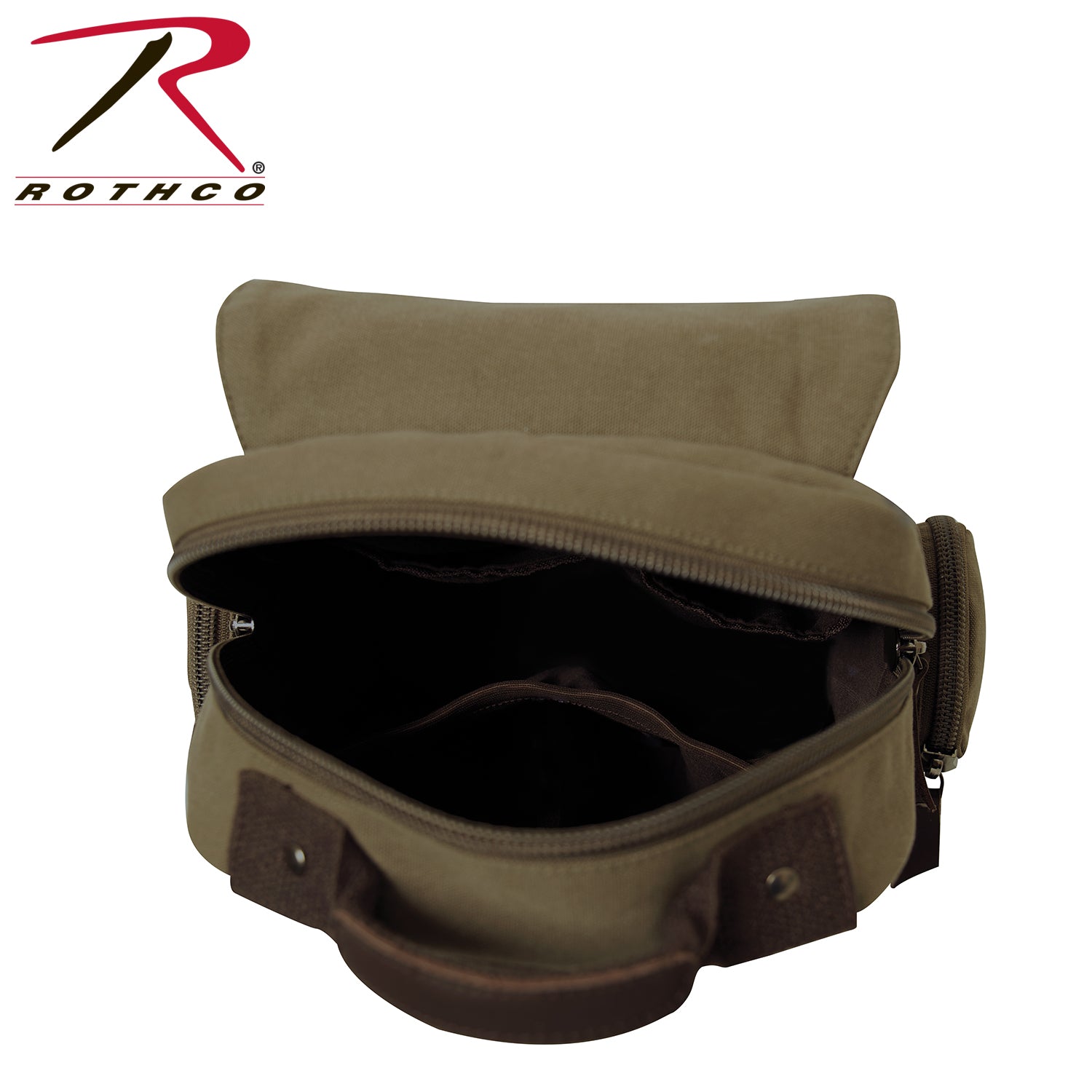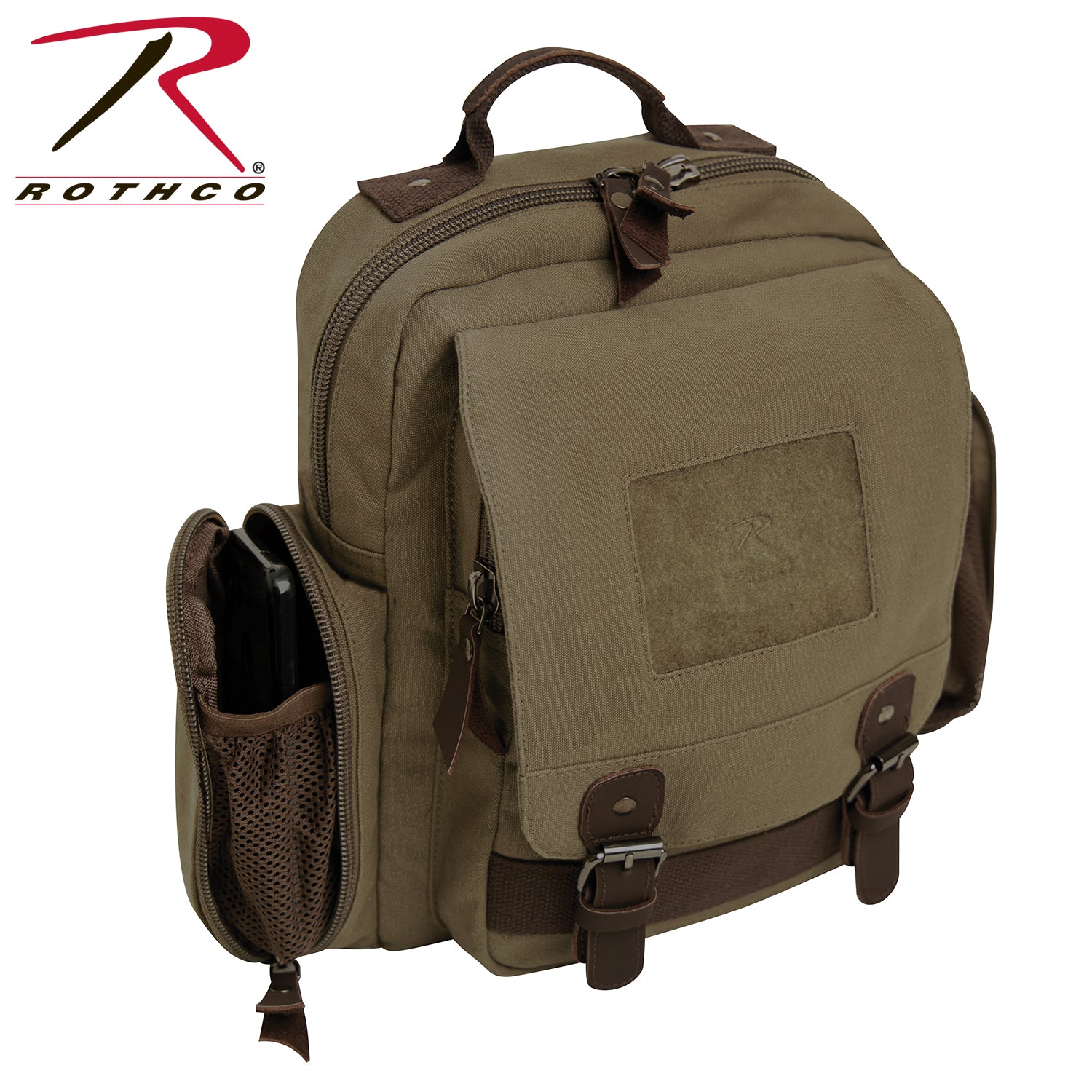 Rothco’s Vintage Canvas Sling Backpack combines timeless style with practical features, making it an ideal companion for travel, hiking, or everyday carry. Crafted from soft, washed canvas, this bag offers an authentic vintage look, enhanced by sleek leather and metal accents. The adjustable padded sling strap allows you to wear the backpack over either shoulder, ensuring comfort throughout the day. The spacious main compartment can easily store tablets and other essentials, while internal pockets keep your items organized with ease. 2 side pockets, designed with elastic and mesh interiors, provide extra storage for items like sunglasses or water bottles. The magnetic flap closure, secured with leather accents, gives easy access to your belongings, while the double zipper closure ensures added security. A loop field on the front allows for customization with flags or patches, making this a stylish and functional bag for any adventure. Made from Rothco’s durable heavyweight canvas fabric, this superior material is naturally water-resistant, rugged, and is built for the long haul. No one comes close to Rothco’s collection of ultra-premium canvas bags and packs.
