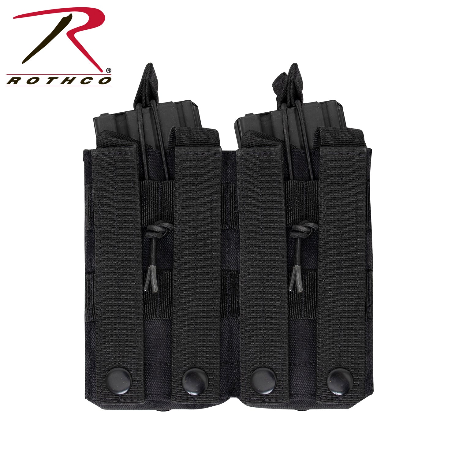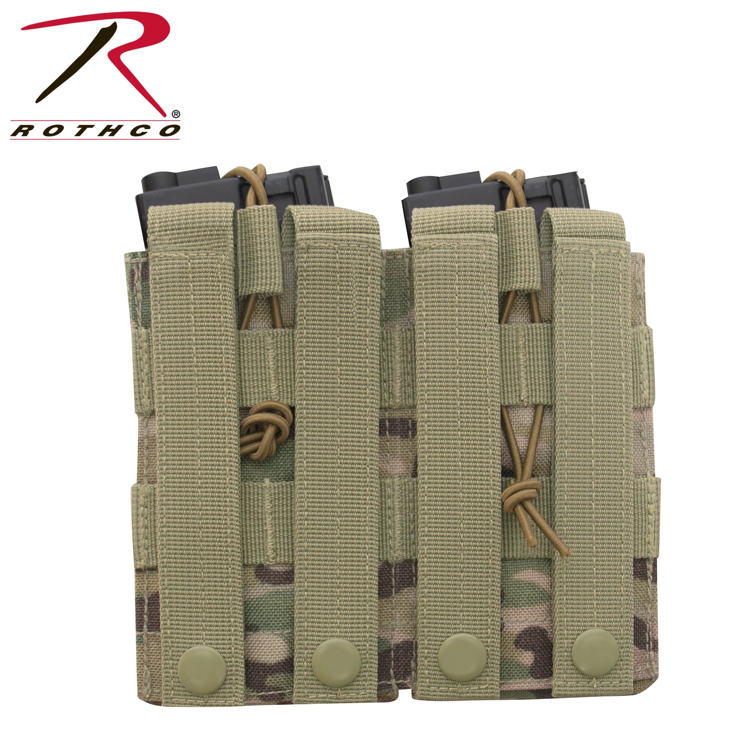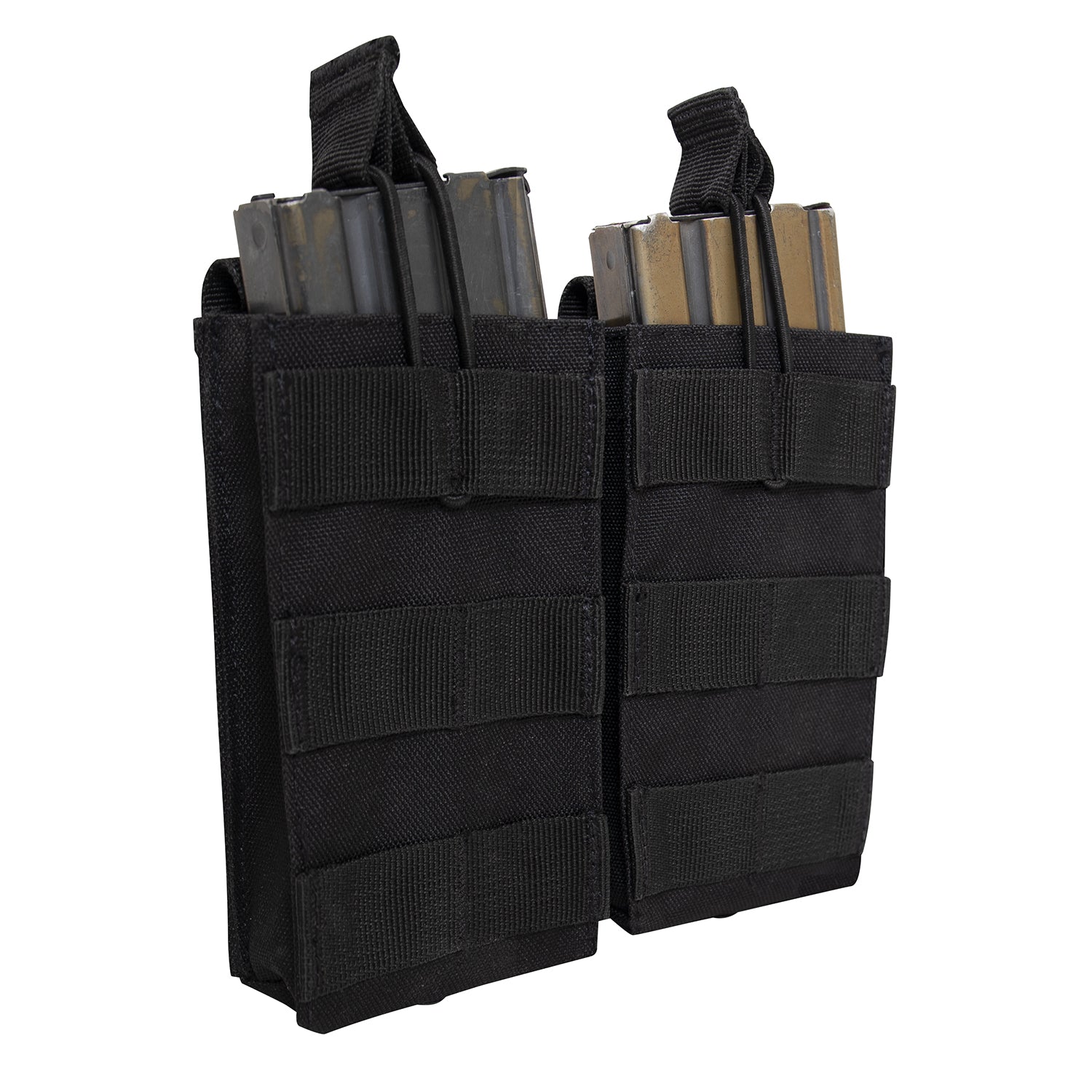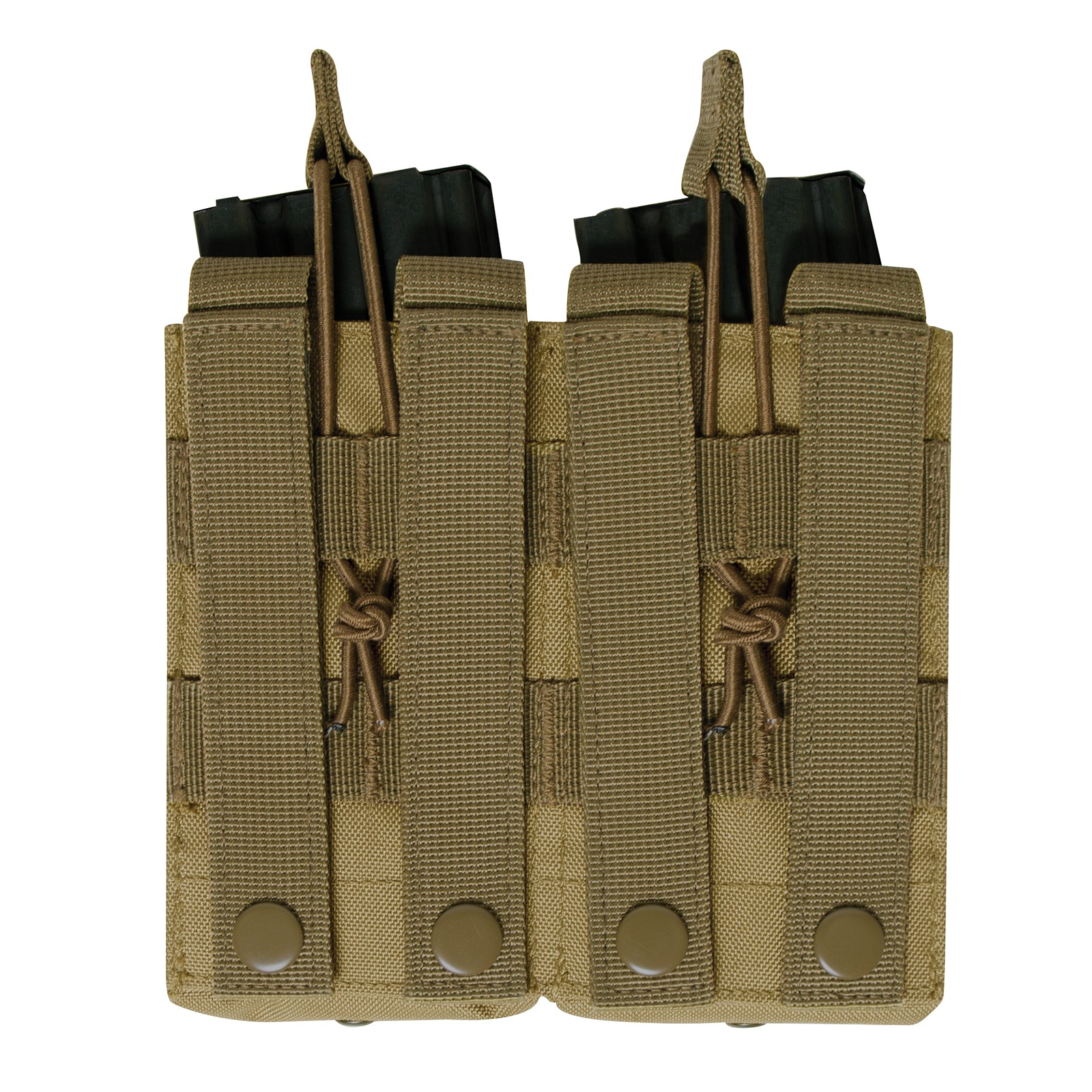 Safely secure your spare mags at the range with Rothco’s MOLLE Open Top Double Mag Pouch. This MOLLE compatible double magazine pouch with four MOLLE straps on the back and six MOLLE loops on the front for securing to tactical vests, assault packs, duty belts, or anything with a MOLLE panel. The mag pouch features elastic cord closures with pull tabs that enable rapid access to your ammo. Rothco’s tactical magazine pouch reliably fits standard-sized M-16 mags, AK-47 mags, and more.