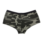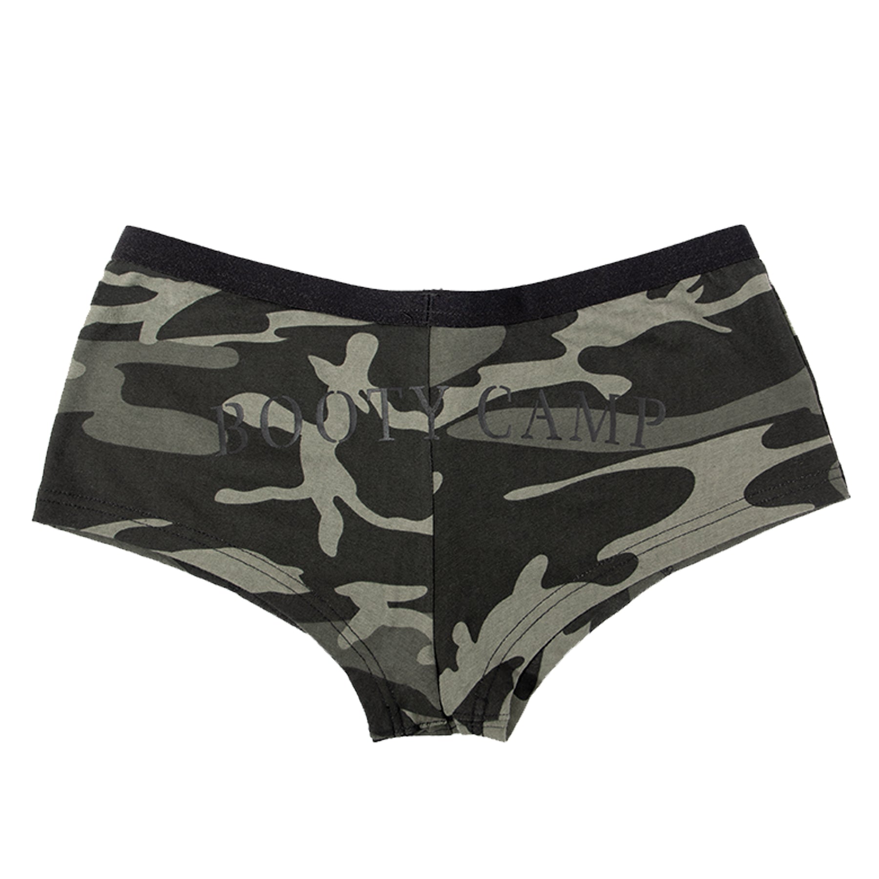 Rothco Black Camo "Booty Camp" Booty Shorts feature "Booty Camp" text on the rear.