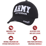 Showcase your dedication with Rothco’s Deluxe Low Profile Veteran Cap. This baseball cap features raised embroidered "ARMY" and "Veteran" symbols, boldly representing your commitment and service. Constructed from durable brushed cotton twill, it ensures lasting comfort and wear. The rugged hat design includes 6 ventilation holes that provide enhanced breathability, making it ideal for outdoor activities. An internal sweatband effectively manages perspiration, keeping you cool and dry throughout the day. Additionally, the sandwich brim highlights your branch of service with a woven label, adding a touch of pride to your headgear. Whether you're tackling the cold in one of our Watch Caps or Balaclavas or out on a mission in a Boonie Hat or Fatigue Cap, Rothco's headwear collection offers unmatched comfort and protection for everyone from active-duty personnel to outdoor enthusiasts.