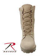 Conquer challenging terrains with our Speedlace Jungle Boots, a fusion of combat boot durability and running shoe comfort, featuring a durable canvas, suede leather, and polyester upper construction for intensive training and rugged outdoor environments while keeping your feet dry, cool, and protected. The uniform boot is great for military personnel, tactical professionals, and outdoor enthusiasts. Rapid Response: These military jungle boots come equipped with Rothco’s nylon-coated brass speedhook and eyelet lacing system for quick, efficient, and secure tying. Enhanced Grip: Navigate any terrain confidently with a non-slip vulcanized rubber outsole with a cleated Panama sole for maximum traction that supports quick and sharp movements while out in the jungle, field, or other outdoor environments. Long-Lasting Support: The lightweight duty boot features an 8-inch height and reinforced seams for dependable durability and ankle support. The internal steel stank helps reduce stain on your heel and calf while providing additional stability and support. Enduring Comfort: These tactical uniform boots utilize a padded collar, sponge lining, pine board midsole, and a removable cushion insole for providing all-day comfort while on duty or off duty.