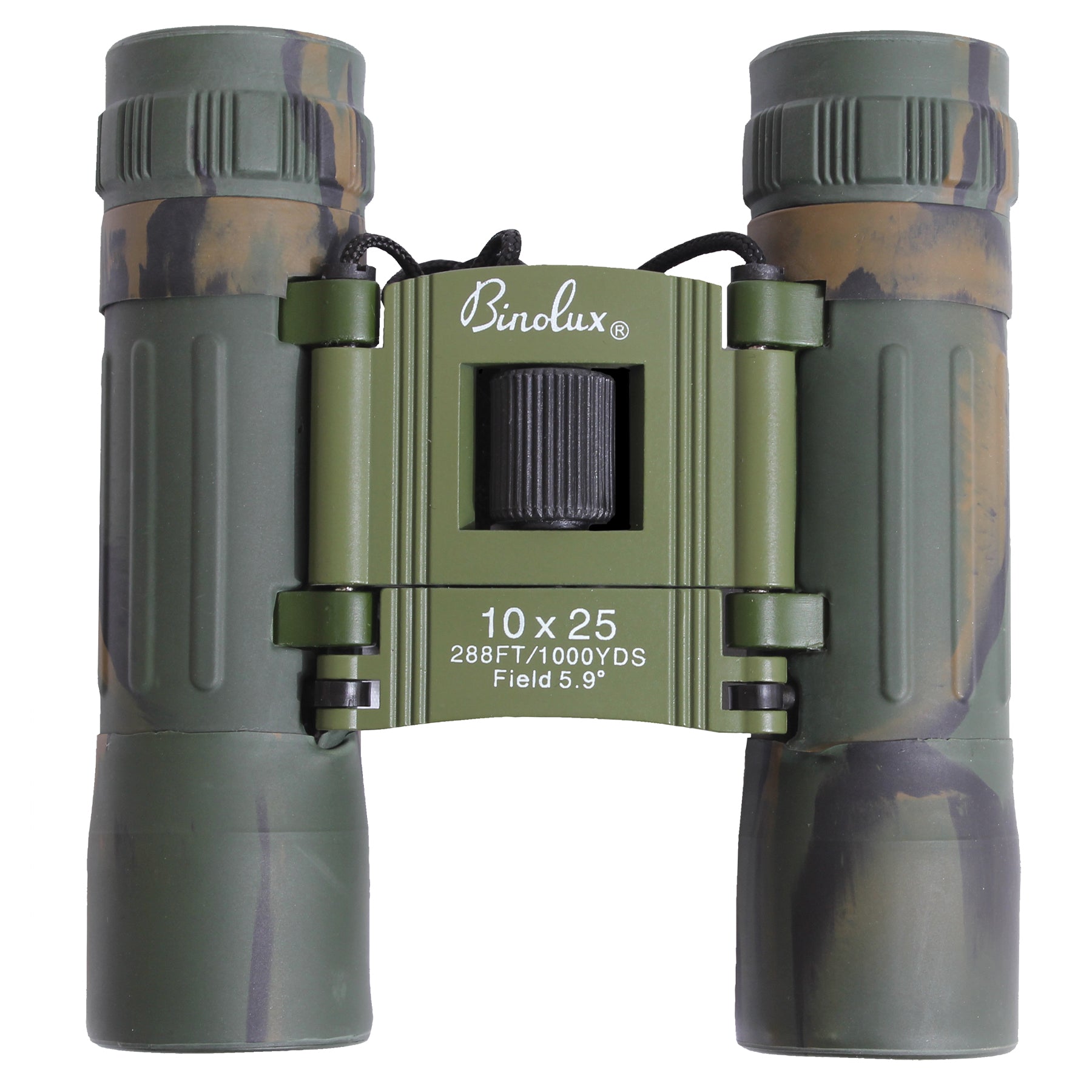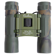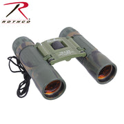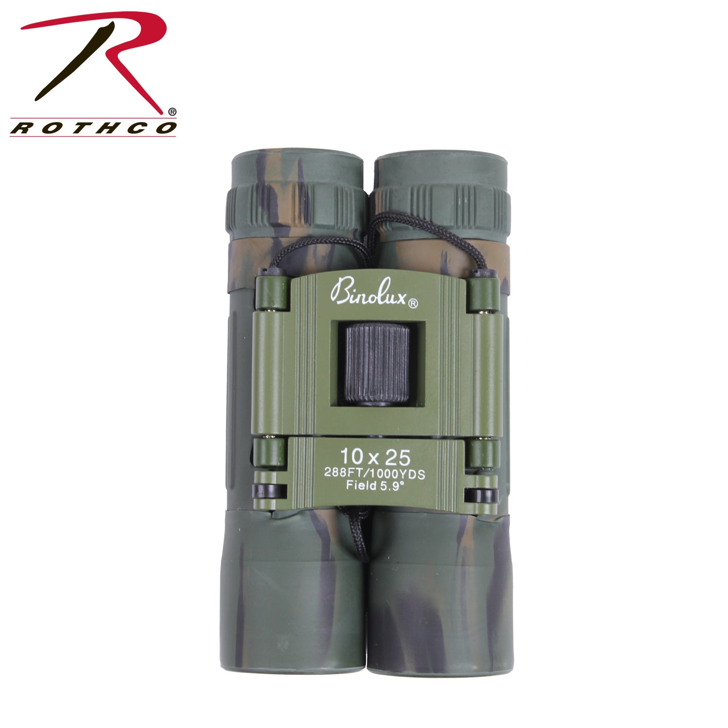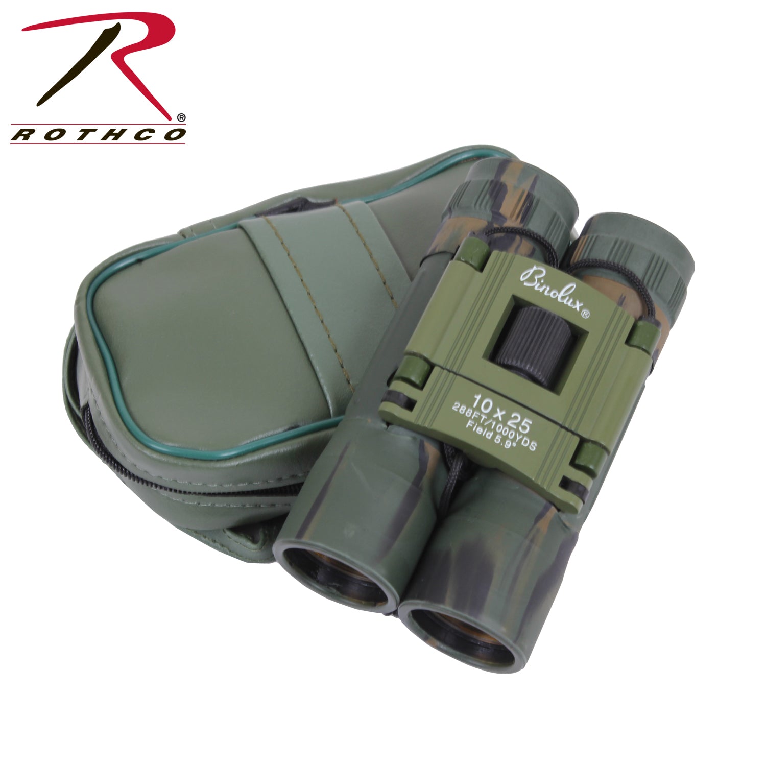 Rothco's Camo Compact Binoculars feature a 10" X 25" CF camouflaged compact roof prism, rubber covered for extra protection, rubber eye cups, field of view 288 Ft At 1,000 Yards. The binoculars also include a carrying case.