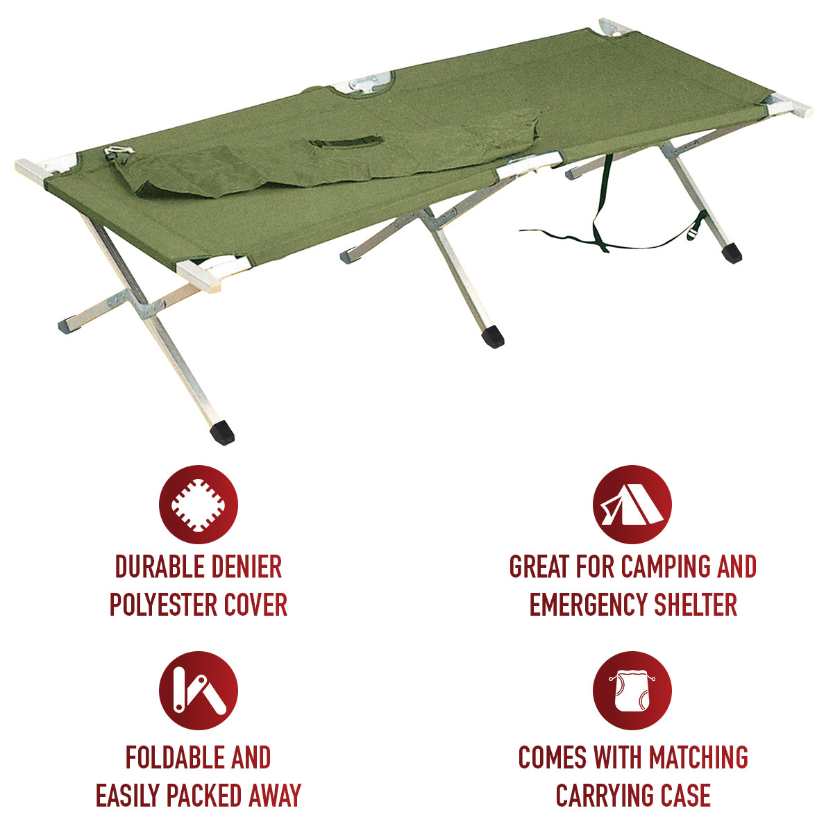 Experience comfort on the go with Rothco's Folding Cot. Boasting tough aluminum legs and a center bar, it supports up to 300 pounds. The denier polyester cover ensures durability and body support for a restful sleep. Easy to set up, this emergency cot measures 75" x 26" x 17 ½" when opened, providing ample space. When the adventure ends, it folds neatly for storage in the included polyester carrying case. Ideal for camping and emergency shelters, the cot's quick setup ensures you'll be camping in no time with reliable, portable comfort.