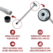 Rothco's Screw-On Gas Nozzle provides a hassle-free and dependable method for fueling up using gas cans. Constructed from durable steel plated with zinc, this nozzle ensures years of reliable performance. Its robust yet malleable design facilitates easy fueling without compromising strength. Featuring a thermoplastic rubber ring, it creates a spill-free seal between the nozzle and gas can, preventing leaks and ensuring a mess-free experience. Whether for camping, hiking, tactical purposes, or long-term gas storage, this screw-on gas nozzle is a versatile solution. With precise dimensions including a tin-plate diameter of 20.5mm, nozzle outer diameter of 22mm, thread mesh diameter of 16.5mm, and bottom screw diameter of 2.25 inches, it guarantees compatibility with various gas can sizes. Trust Rothco's Screw-On Gas Nozzle for efficient and trouble-free fueling wherever you go.