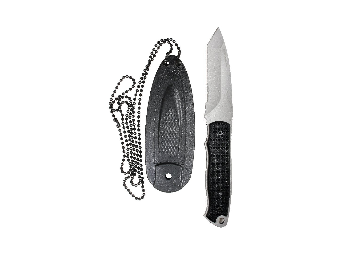 Rothco's Neck Knife With Sheath features a partially serrated blade with bead blast finish, ABS plastic sheath with chain.