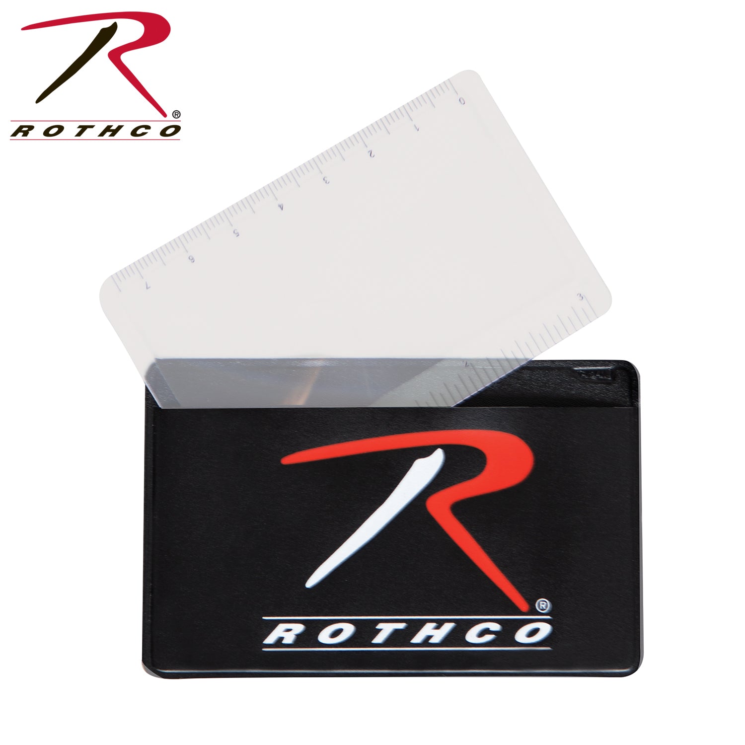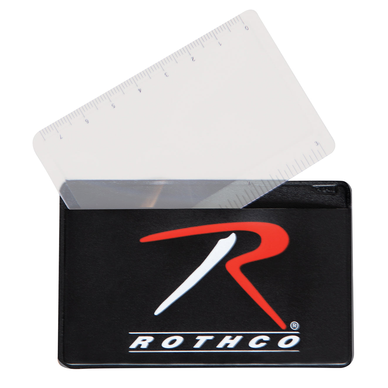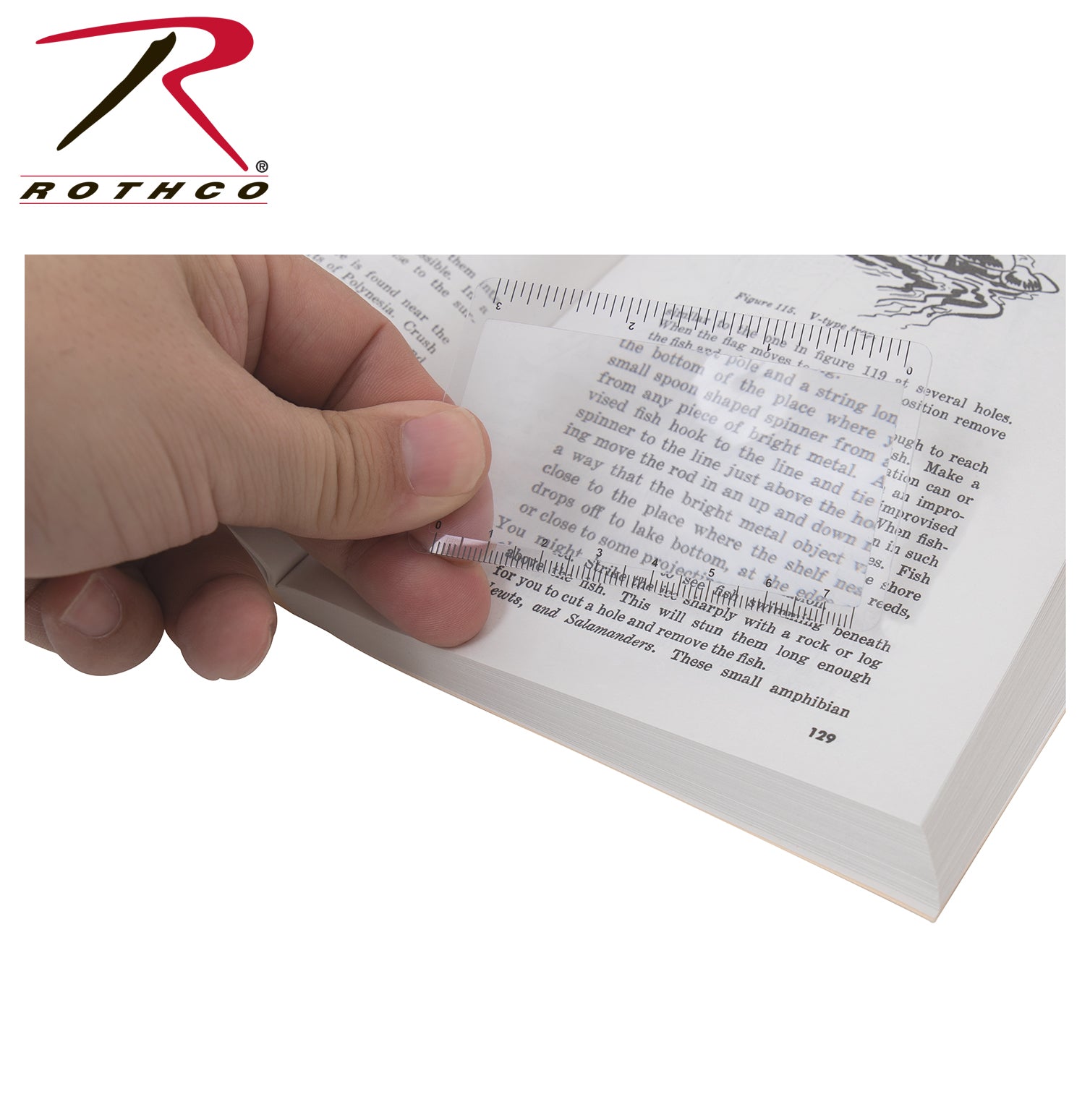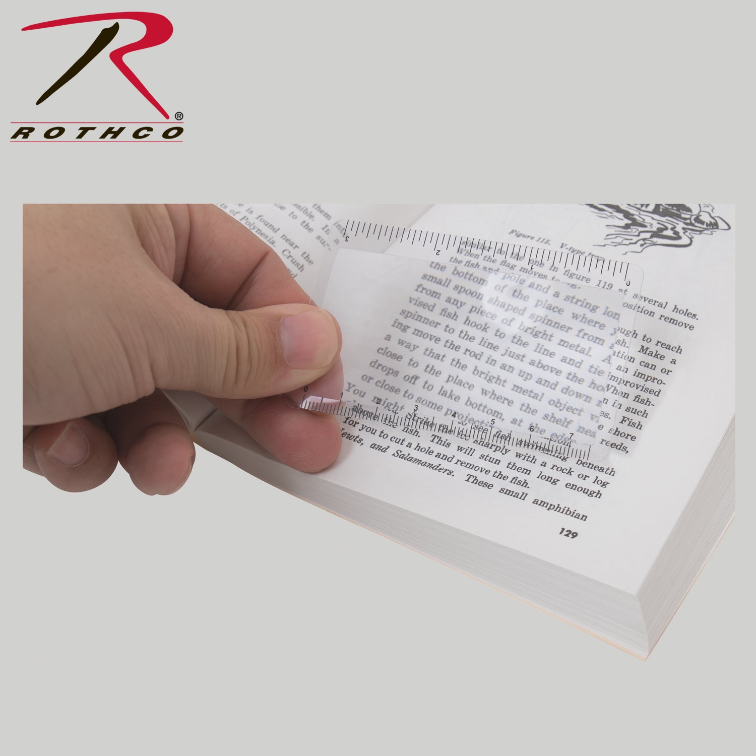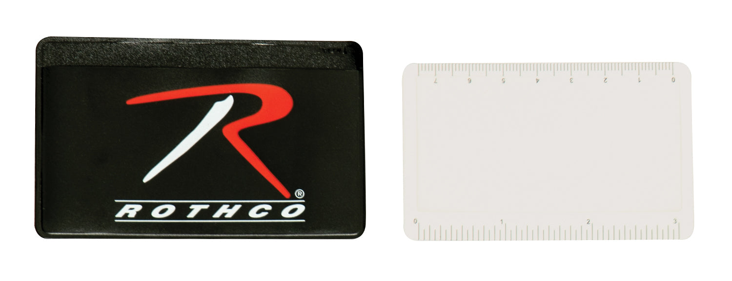 Inspect and measure hard to see items/text with Rothco's lightweight, flexible, and durable survival magnifying card & ruler. Easily store your magnifying card in your pocket, wallet, or pouch for on the go access to clearer vision. Made from a lightweight, flexible, and durable Fresnel lens to withstand any outdoor effects. CM’s and inches are printed along edges to double as a measuring system. Convenient size of most standard credit cards (3.25" x 2 1/8" and .4mm thick). Prepare your bug out bag with this essential survival tool.