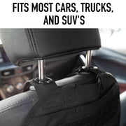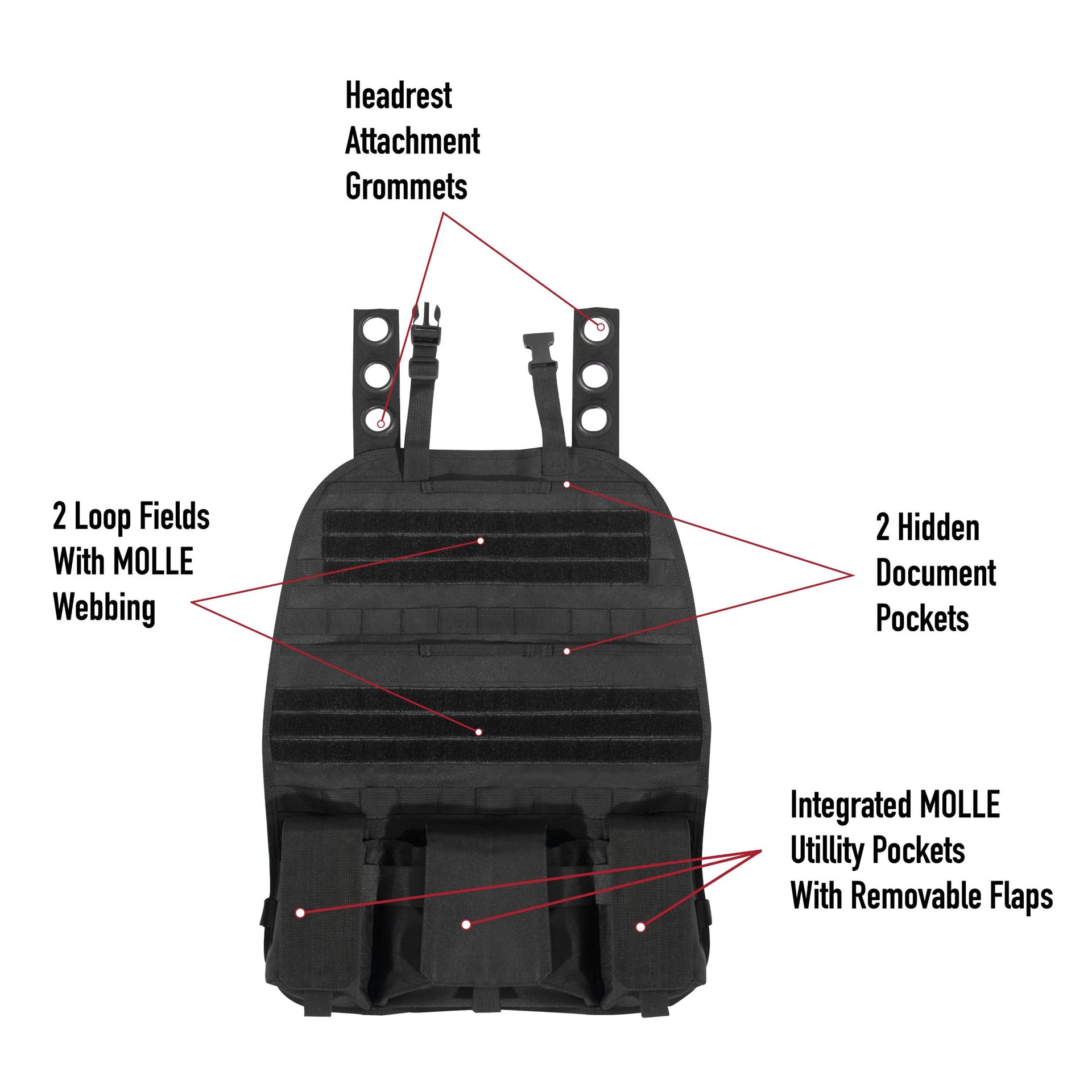 Rothco's Tactical Car Seat Panel enables you to keep your car clean and organized with multiple storage pouches, loop fields, and rows of MOLLE webbing. The tactical seat panel attached to your headrest spikes via two webbing straps with metal grommets for easy installation – multiple grommets enable the organization panel to fit in most standard size SUVs. Three utility pockets with hook and loop closures for storing essential items (center pocket measures 6 inches x 8 inches x 1 inch, outside pockets measure 6 inches x 4.5 inches x 1 inch). The backseat organizer invludes six rows of MOLLE webbing, as well as two loop fields for adding flags, morale patches, and hook-backed attachments. Two document pockets on the tactical panel feature hook and loop closures and web handles for easy opening (Upper pocket measures 17 x 14.25 inches, lower pocket measures 17 x 9.5 inches). The tactical car panel is composed of a rugged 600D polyester material and measures 22.5 inches x 17 inches.
