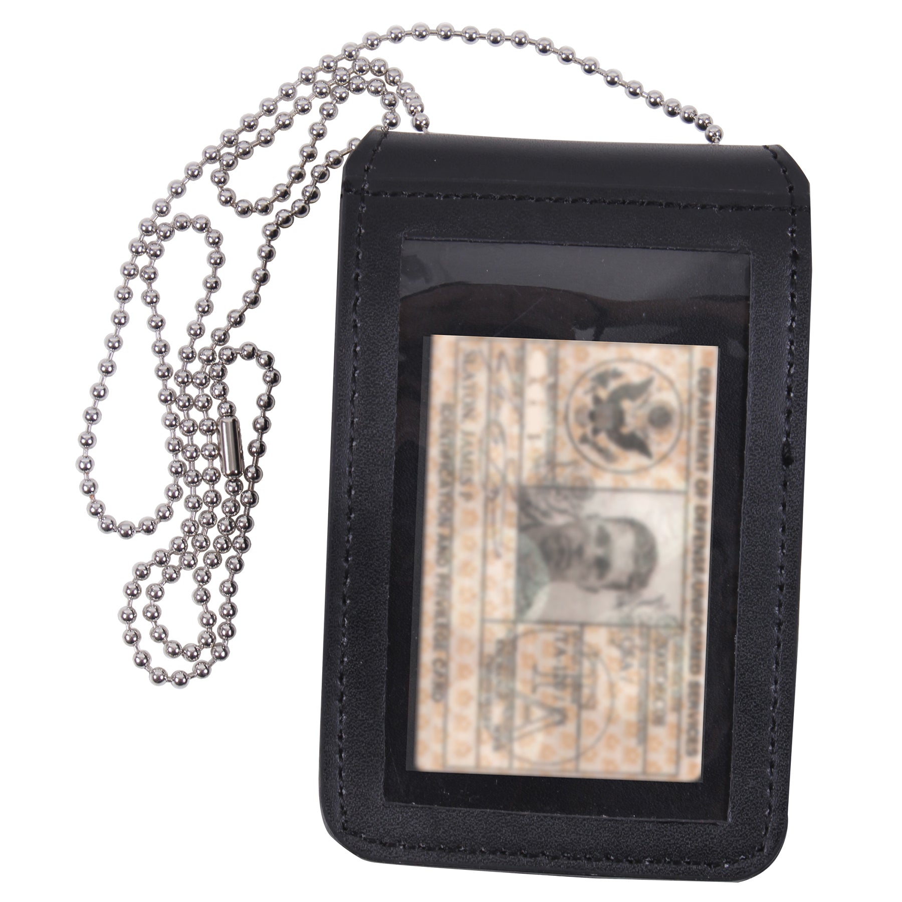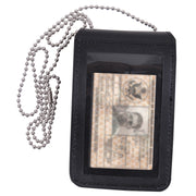 Rothco's Universal Leather Badge & ID Holder is designed to provide secure and convenient access to your badge and ID, perfect for public safety and law enforcement professionals. Made from durable PU leather, this holder features a universal design to accommodate various badge styles. 1 side of the holder offers a clear window to display your ID card, while the other side securely holds your badge with a hook & loop closure. The included 33 inch chain allows for versatile wear around the neck, keeping your credentials accessible and hands-free. An internal pocket provides a neat storage spot for the chain when not in use. This badge and ID holder combines functionality with professional style, making it an ideal choice for anyone needing reliable badge access in their daily work.