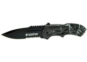 The Smith and Wesson Black Ops Assisted Open Knife has a 3.4 inch 4034 stainless steel blade with 4.3 inch aluminum handle. It has a thumb hole and knob finger with a linear actuator and safety lock.